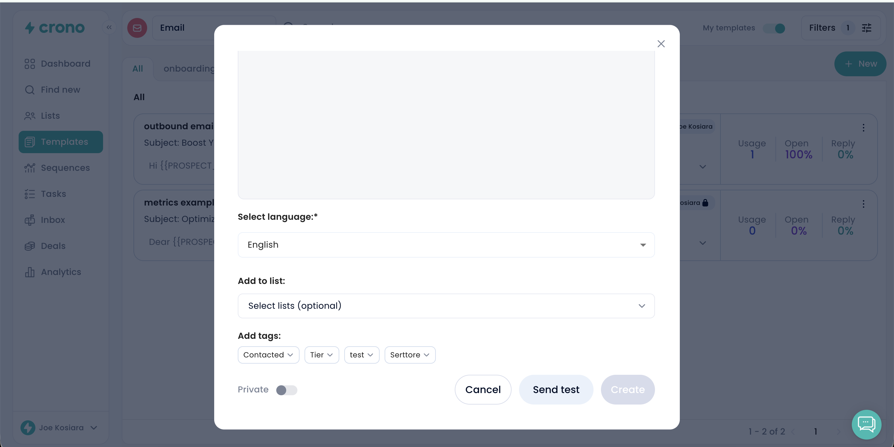 Private toggle — by default, templates are shared with your team and can be viewed or edited by colleagues. Activate this option if you want the template to remain visible and editable only to you.