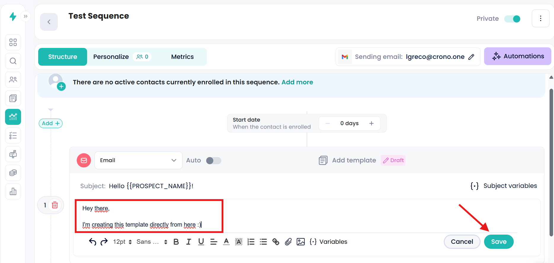 Keep in mind that you can also create templates directly from within the sequence you’re building. Once you’ve added a step, start typing anywhere in the text. When you’re done, click “Save” on the right side of the template to store it.