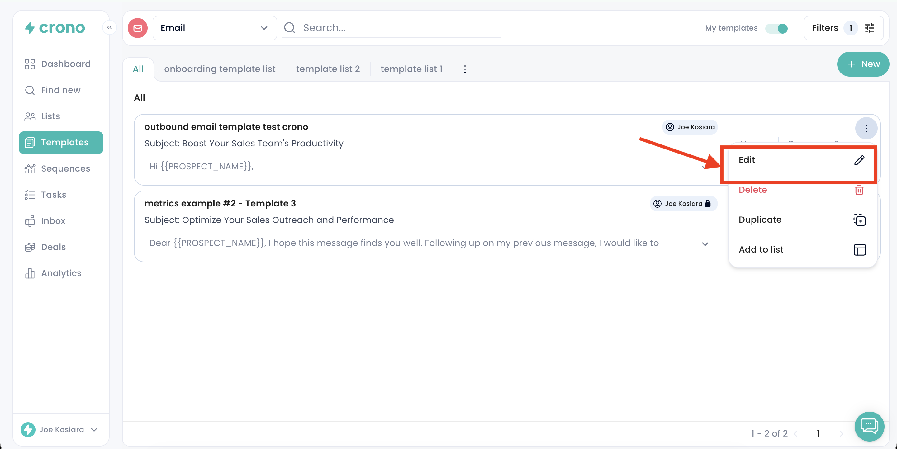 To edit a template, click the three-dot menu located to the right of the template you want to update, then select Edit.