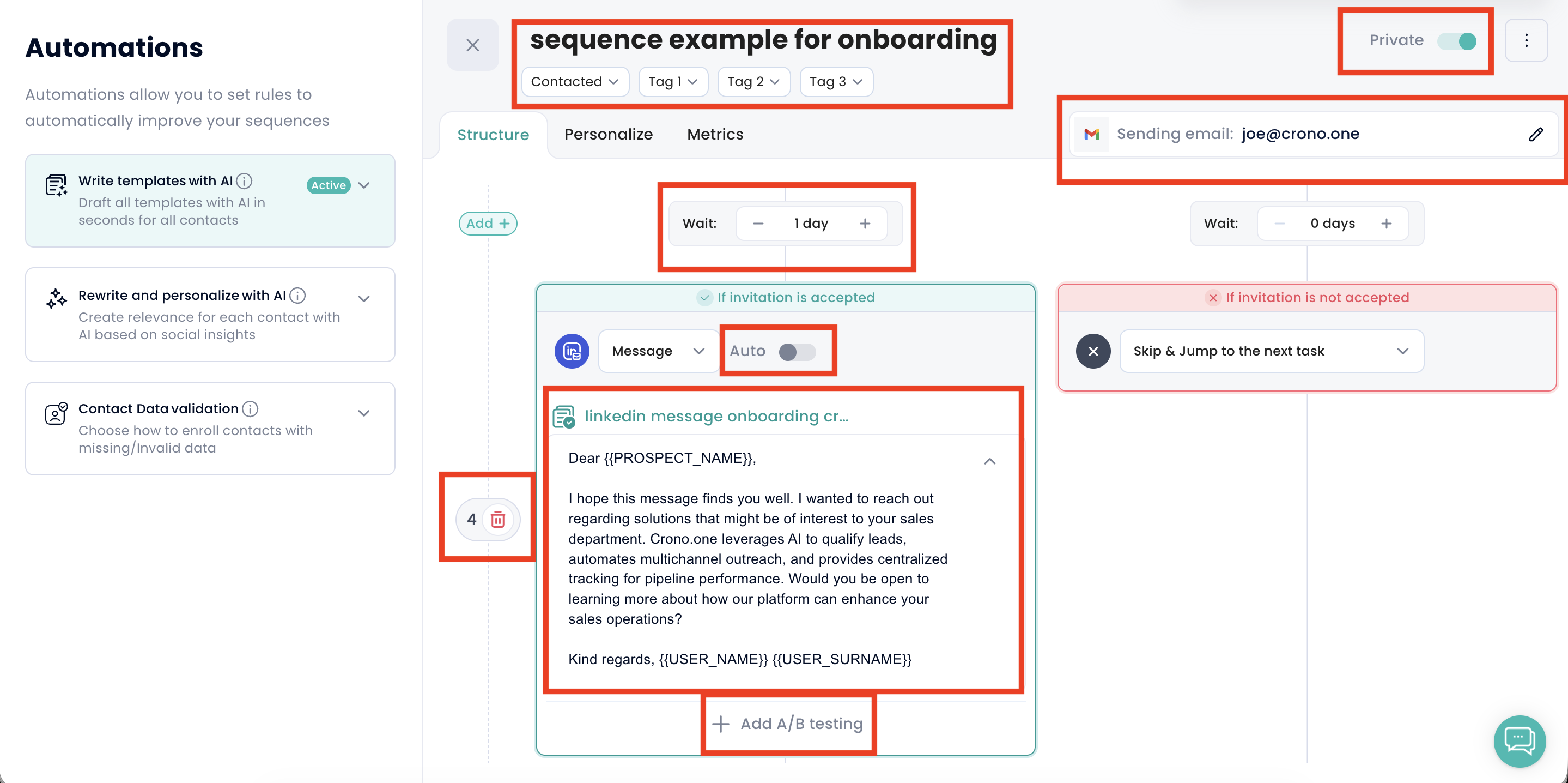 During creation: While building your sequence, you can freely adjust steps, templates, timing, and communication channels.