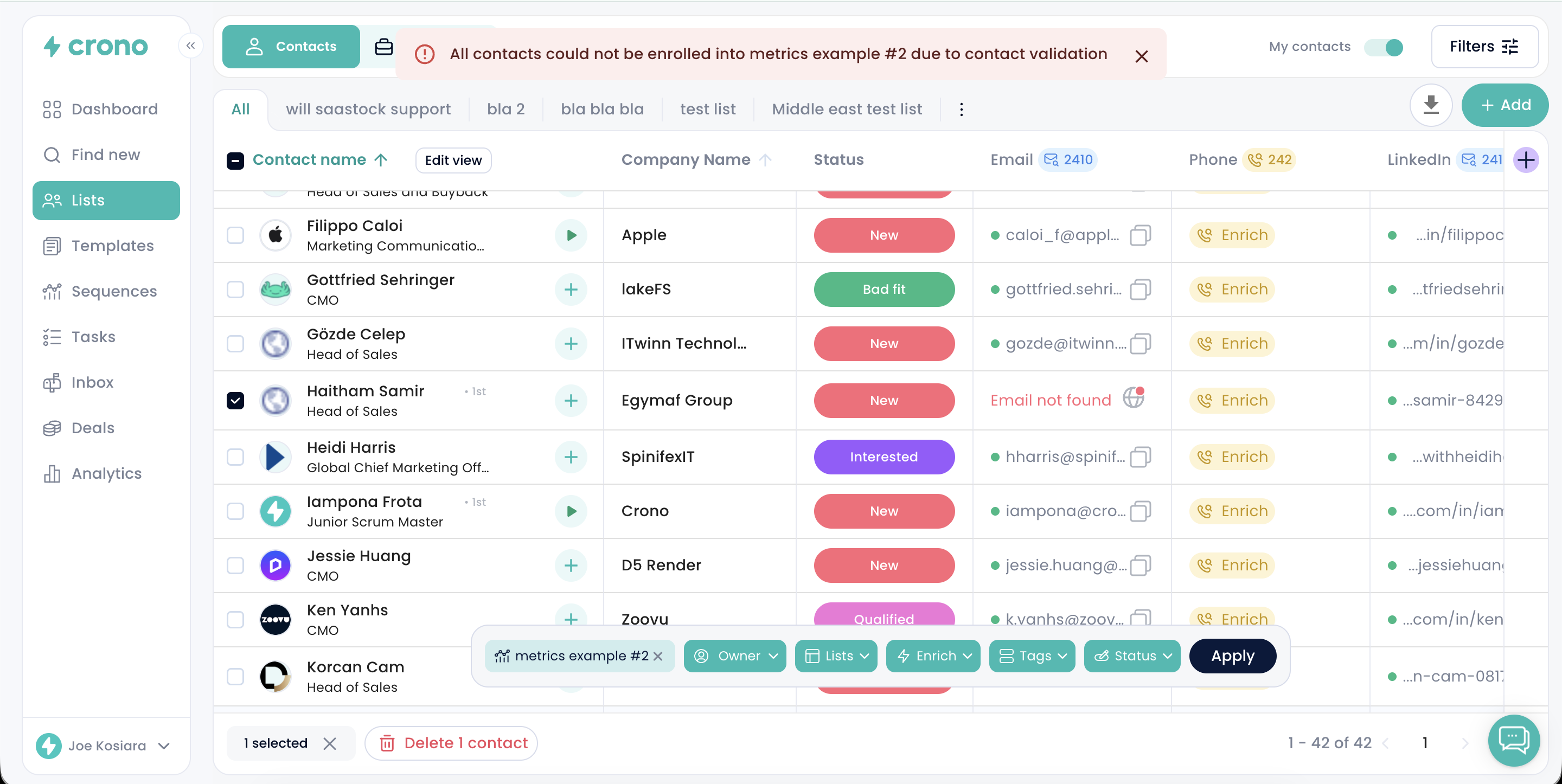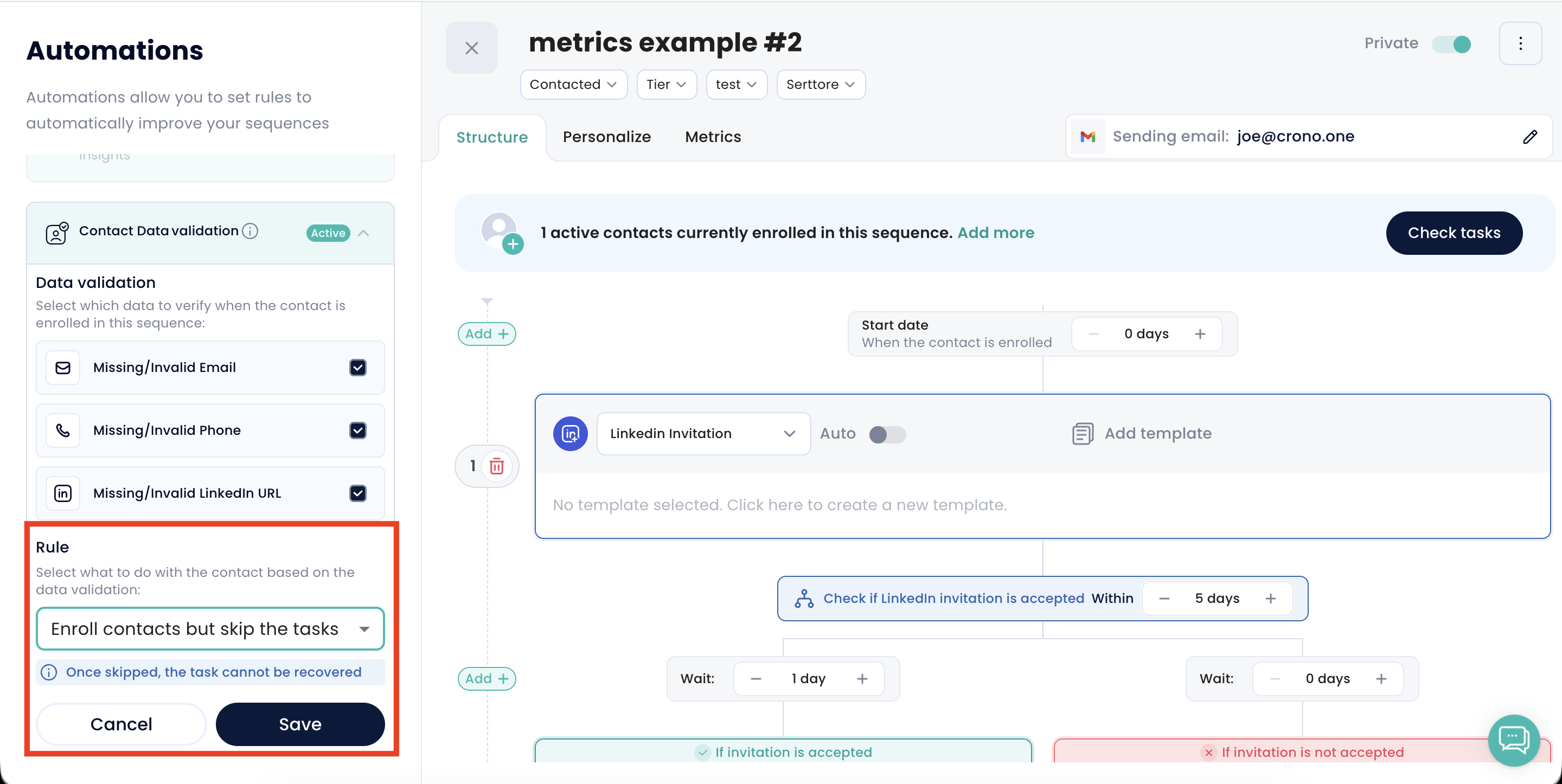 If a contact lacks one or more of the required fields, Crono will automatically prevent them from entering the sequence. This ensures that: