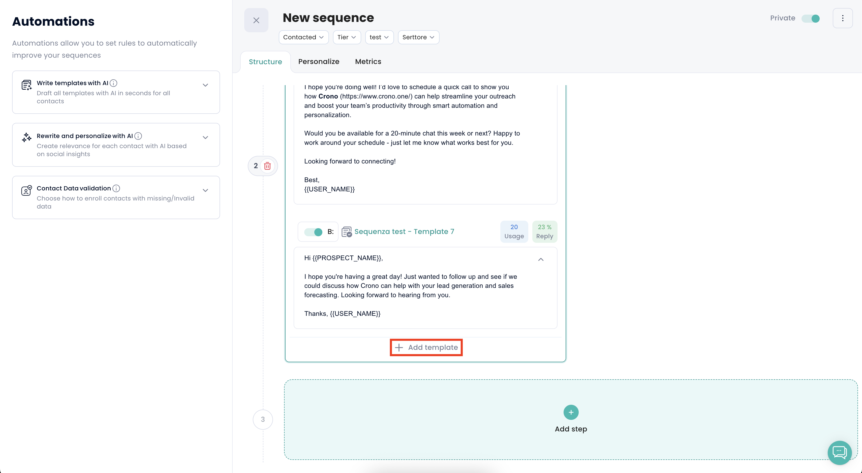 When you add a template to a step inside your sequence, an option will appear to Add more templates for A/B testing.