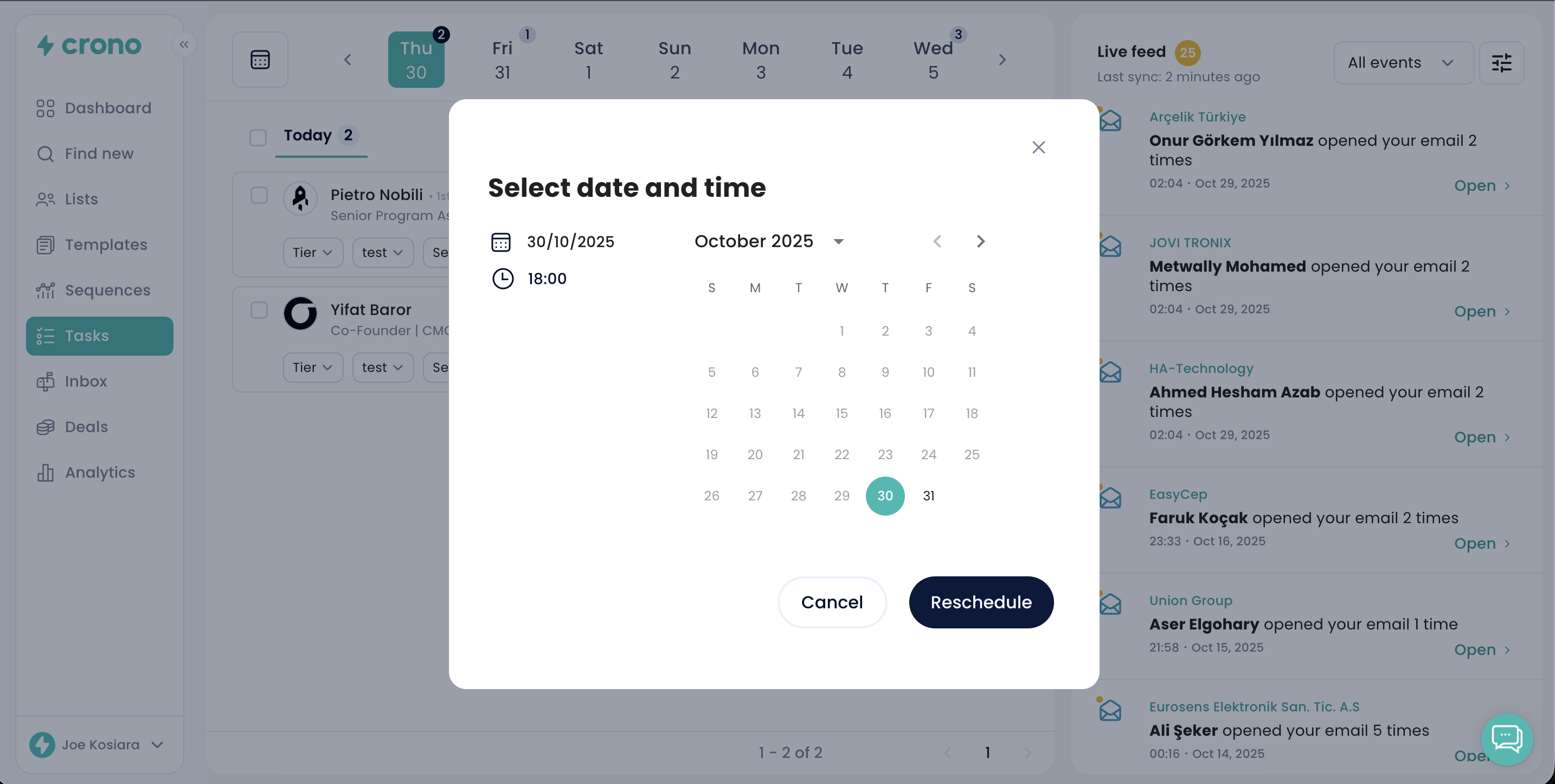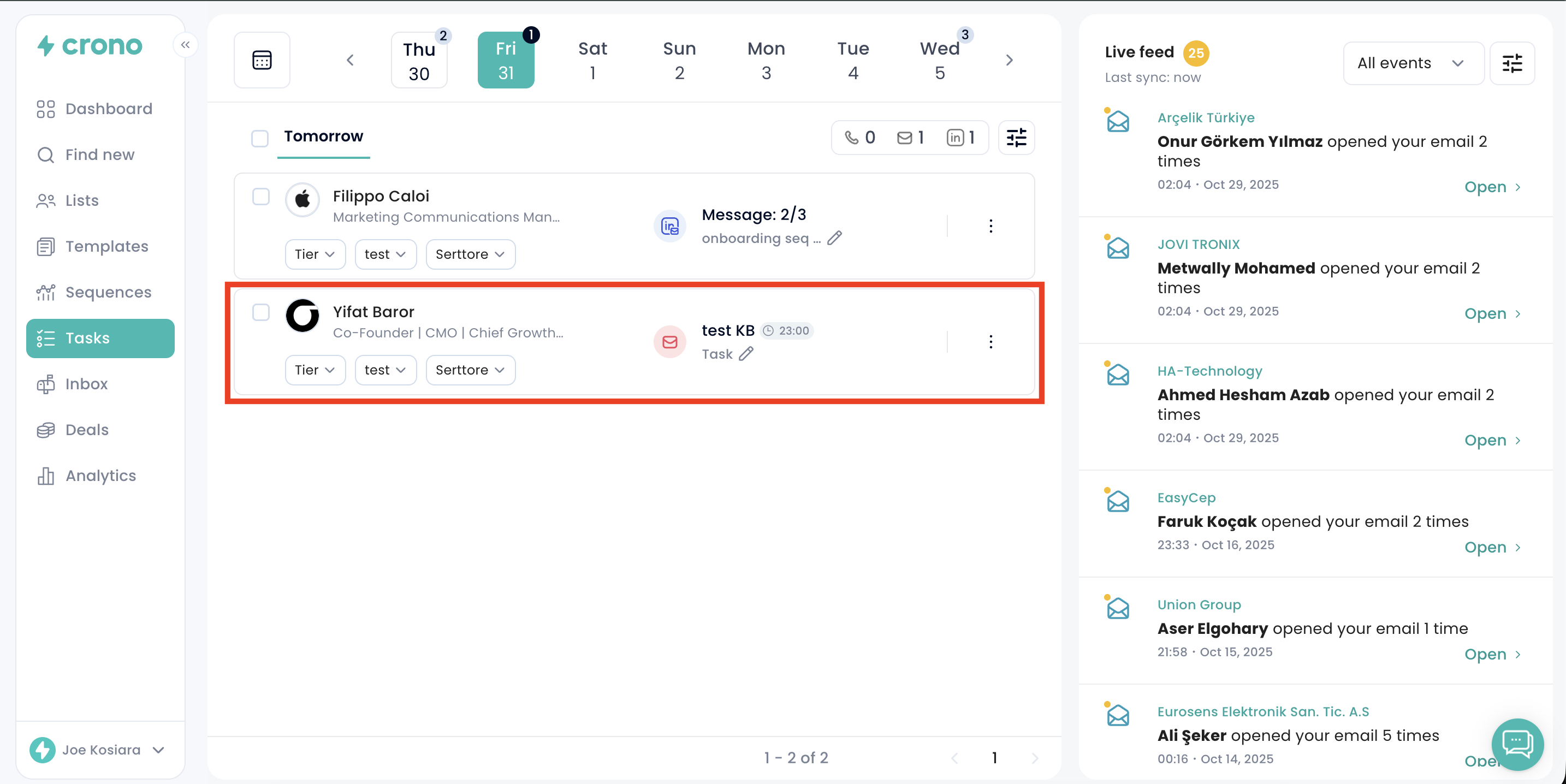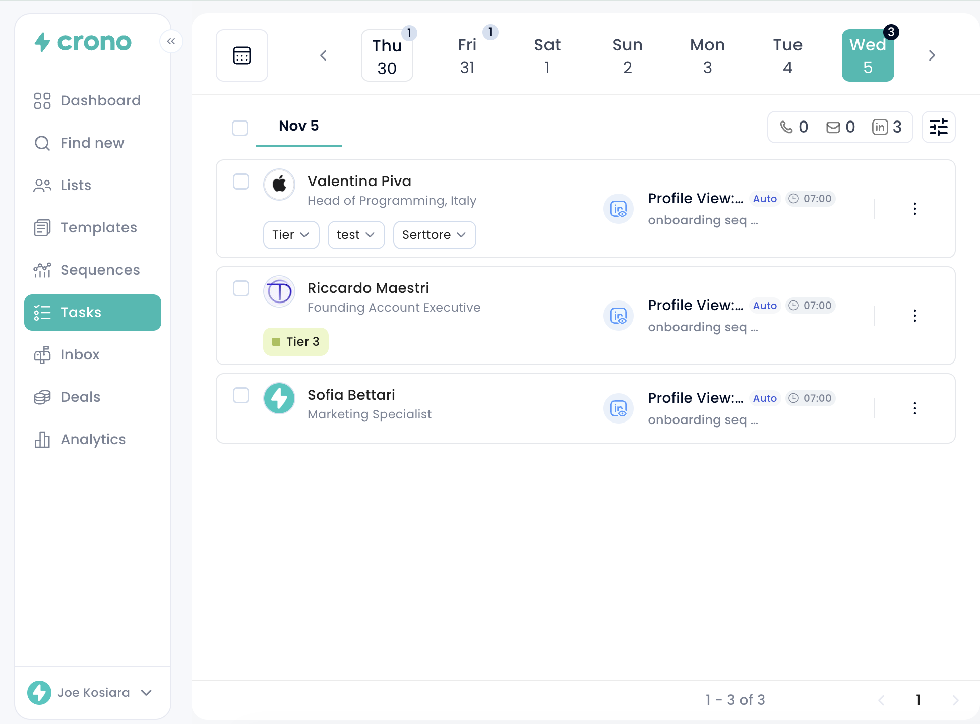 In the Tasks section, you'll find all your tasks distributed across the weekly calendar - both the automated tasks that Crono will handle for you, and the manual tasks that require your direct action.