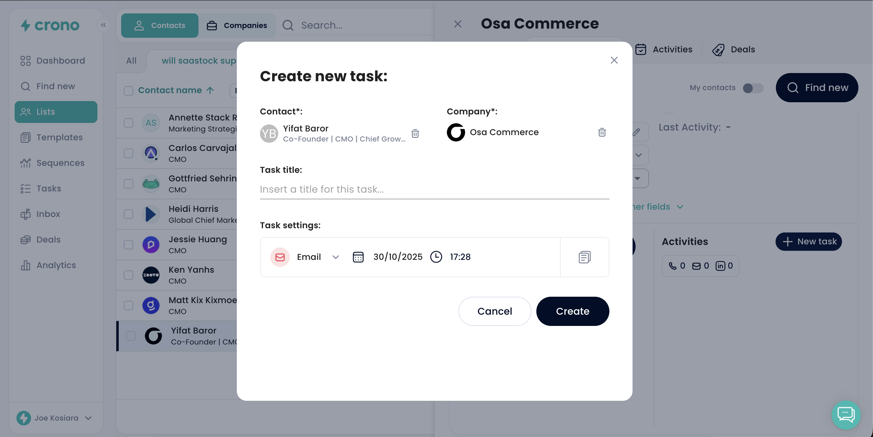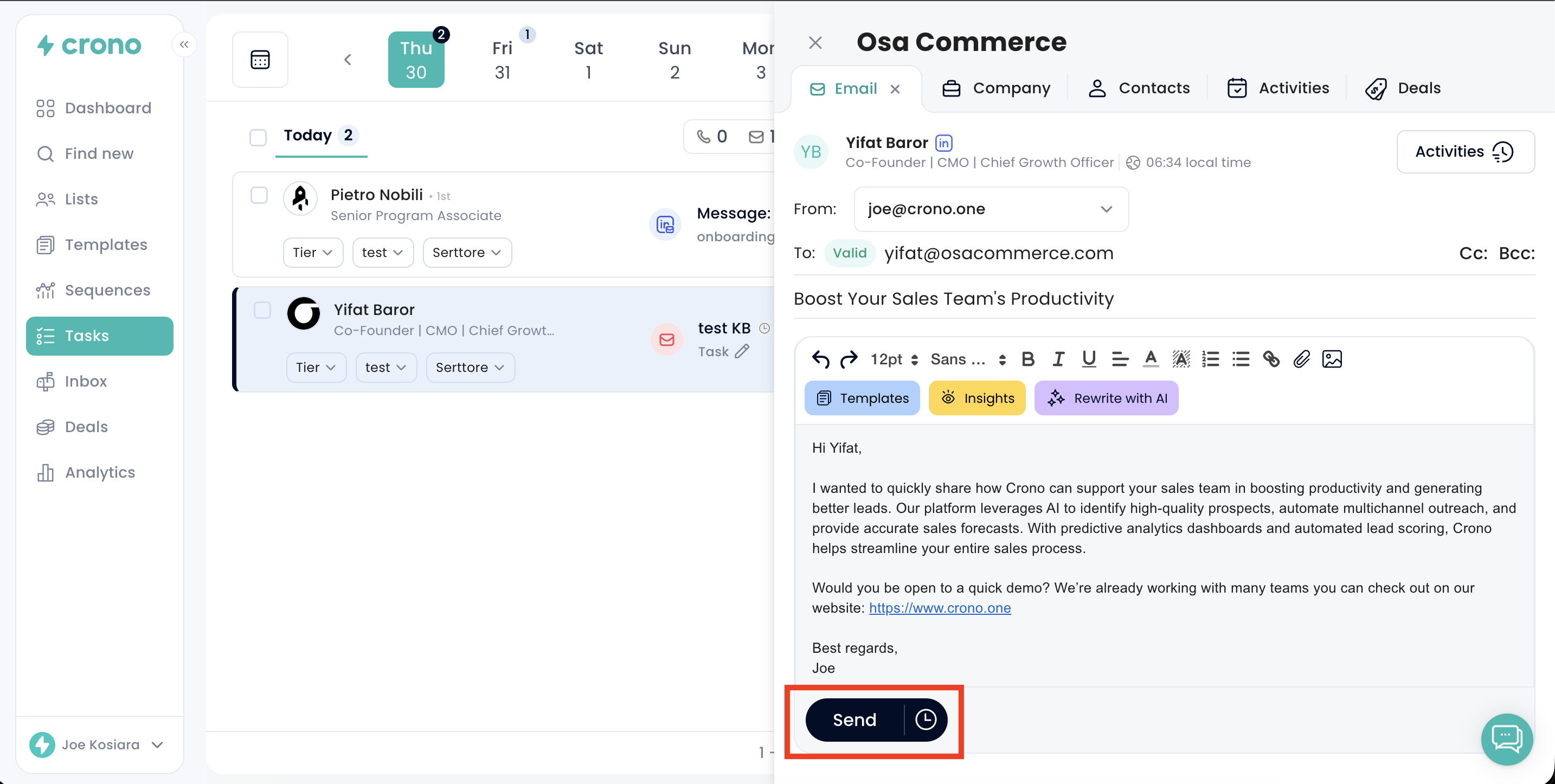 When you click on a task (in this case, Email 1/2), Crono will open the task, allowing you to insert or change the template, edit the text, add recipients, or include people in Cc and Bcc if it’s an email task.