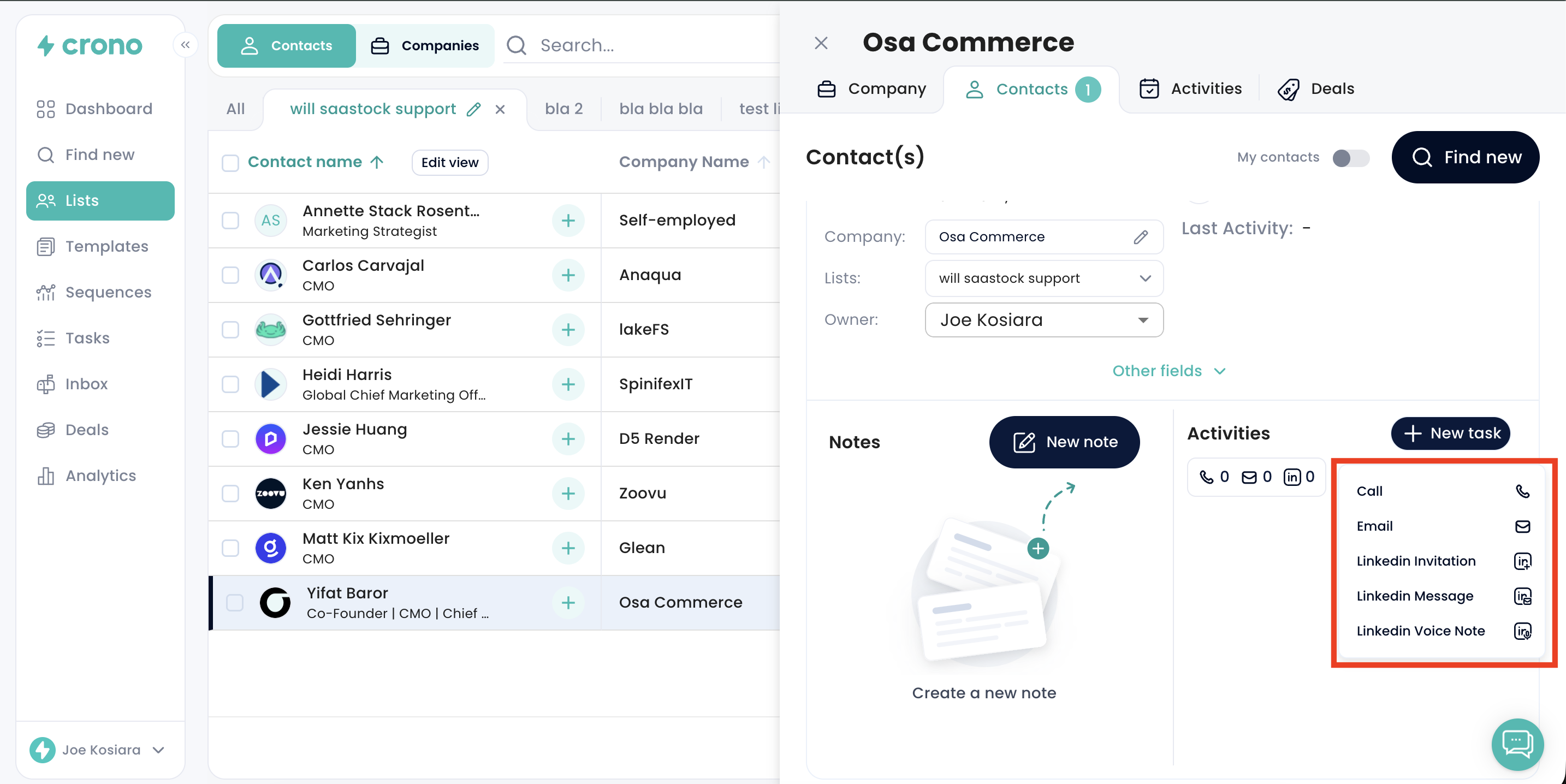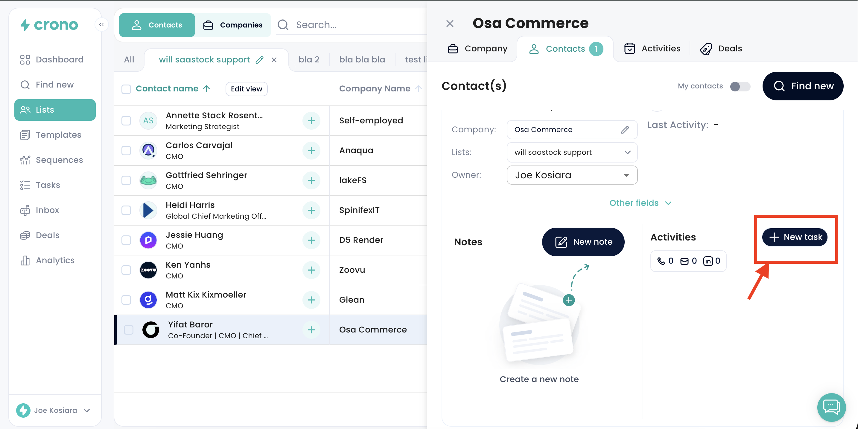 To create a one-off task for a prospect, open the prospect’s contact card and click on New Task.