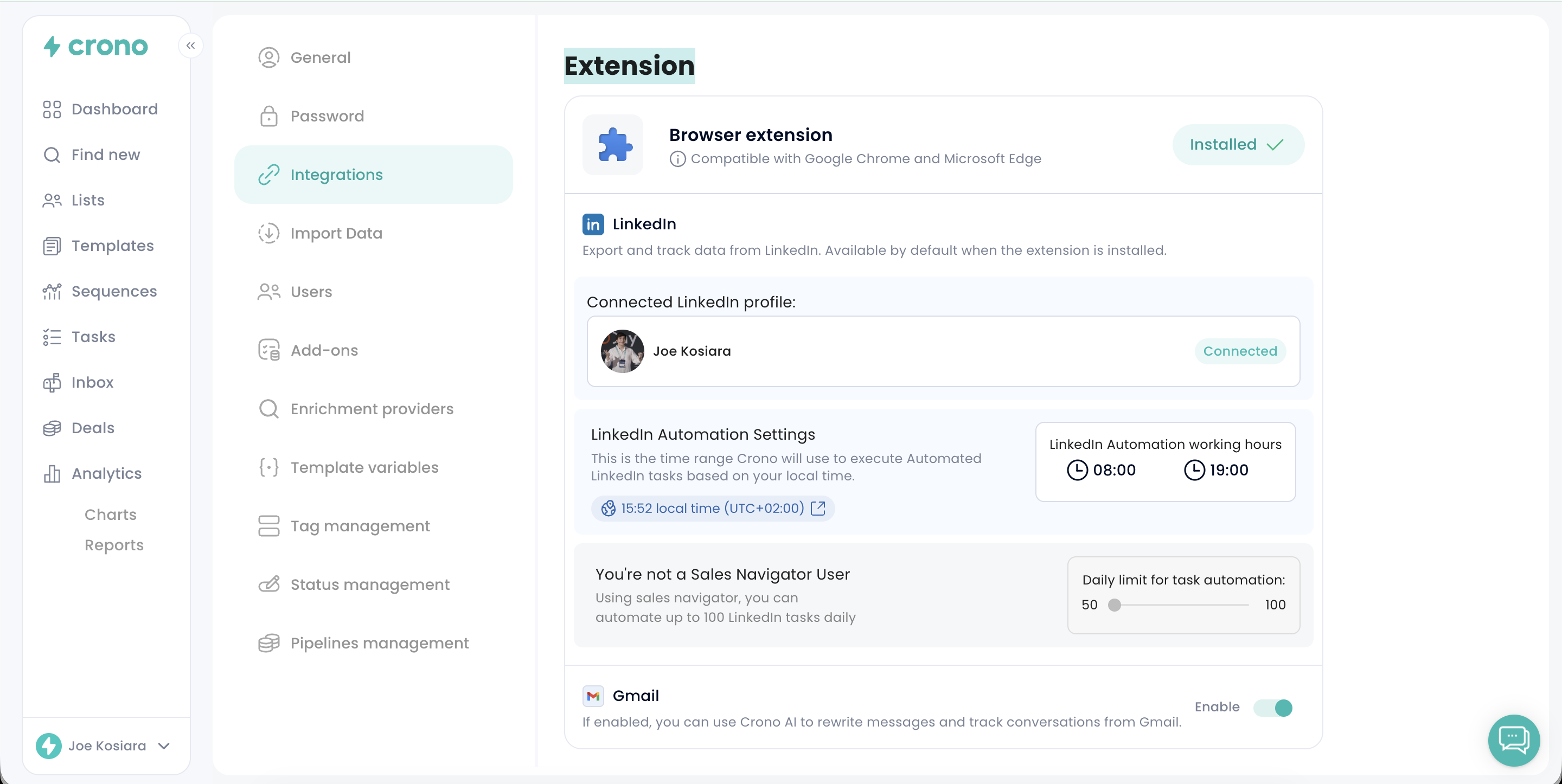 NB: Make sure to open Crono and LinkedIn every day to refresh your LinkedIn session. This ensures that Crono’s browser extension can start properly and allows LinkedIn automation to run smoothly for the day.