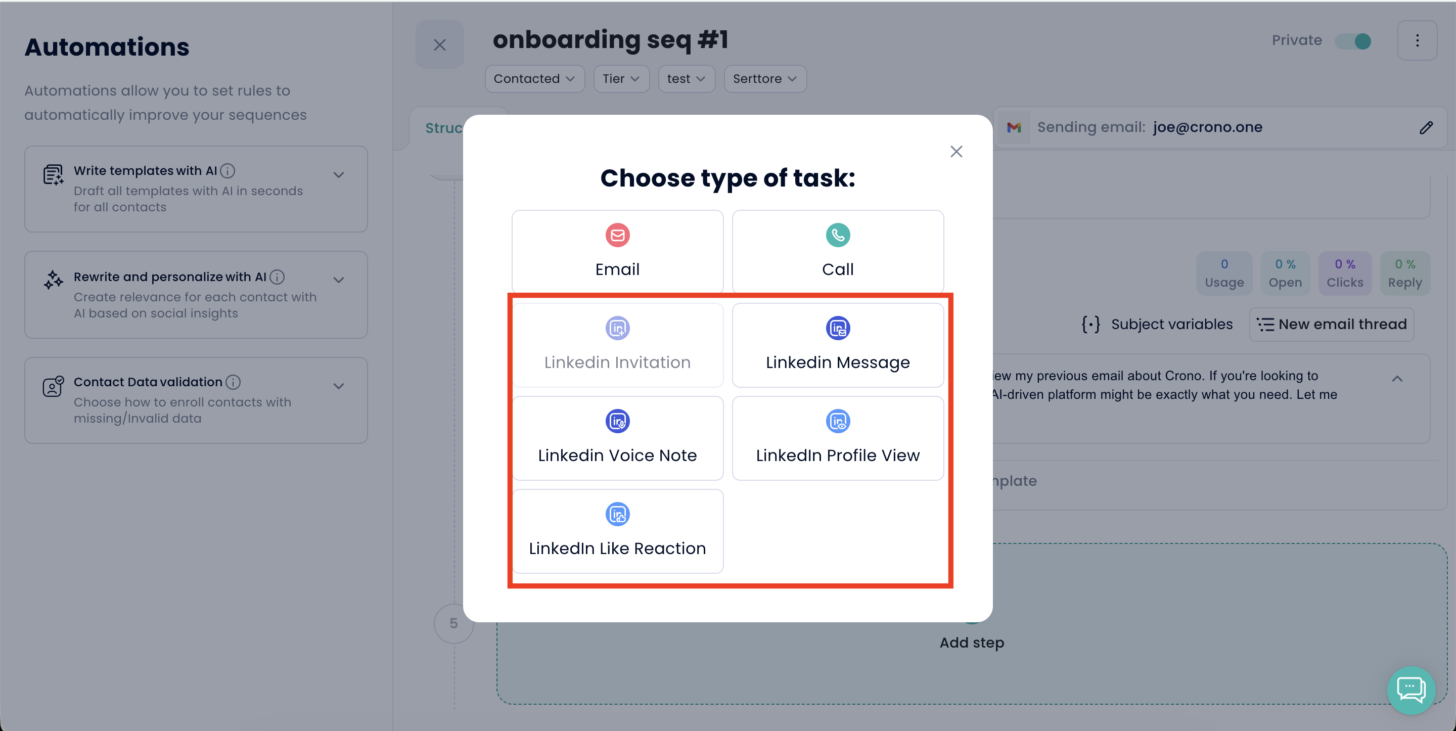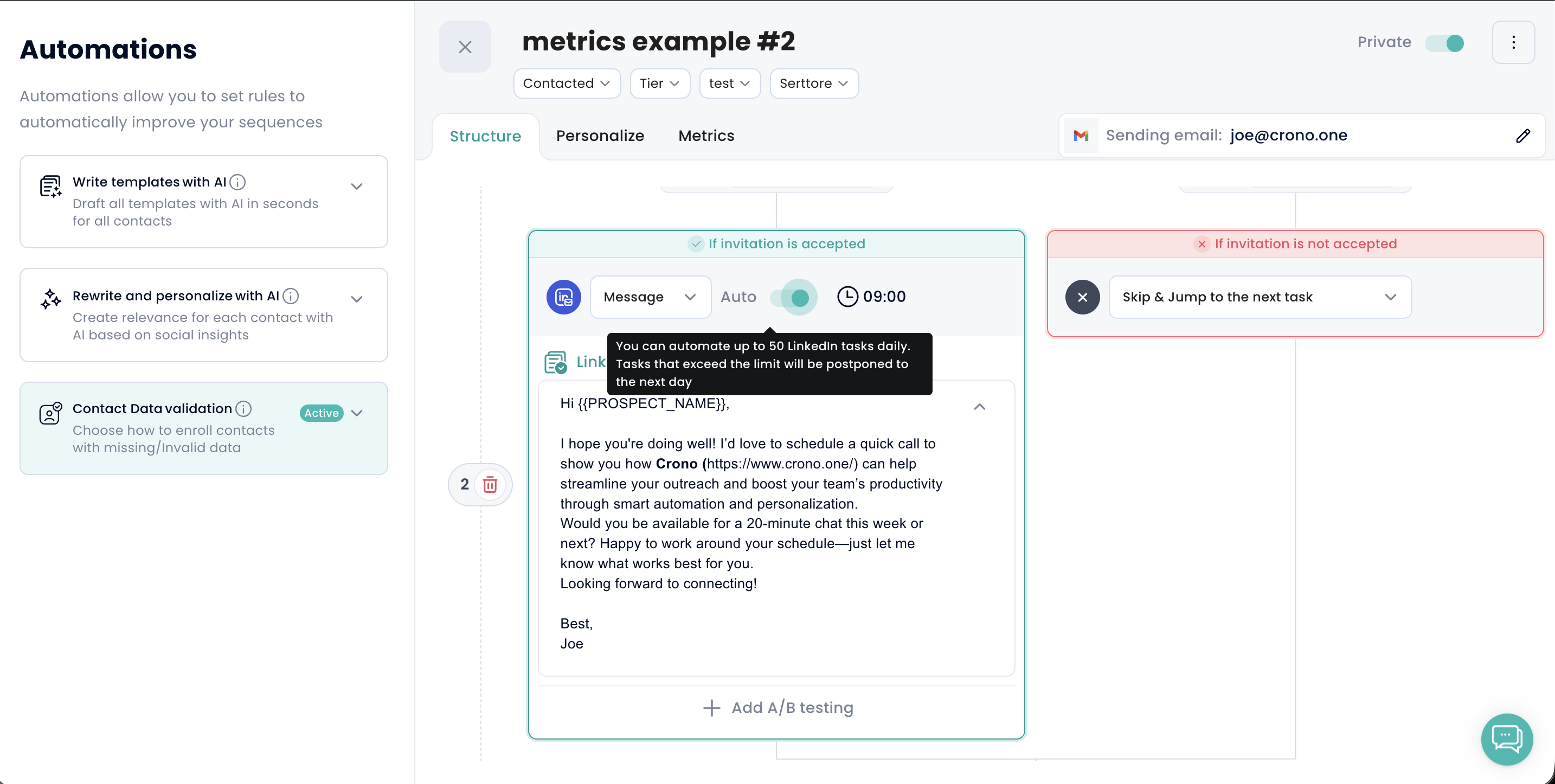 In your Sequences, each email or LinkedIn step can be fully automated by clicking the “Auto” button on that specific step. Once enabled, Crono will automatically send the email or execute the LinkedIn action at the scheduled time — no manual work required. This ensures your outreach flows smoothly and consistently, even when you're offline.