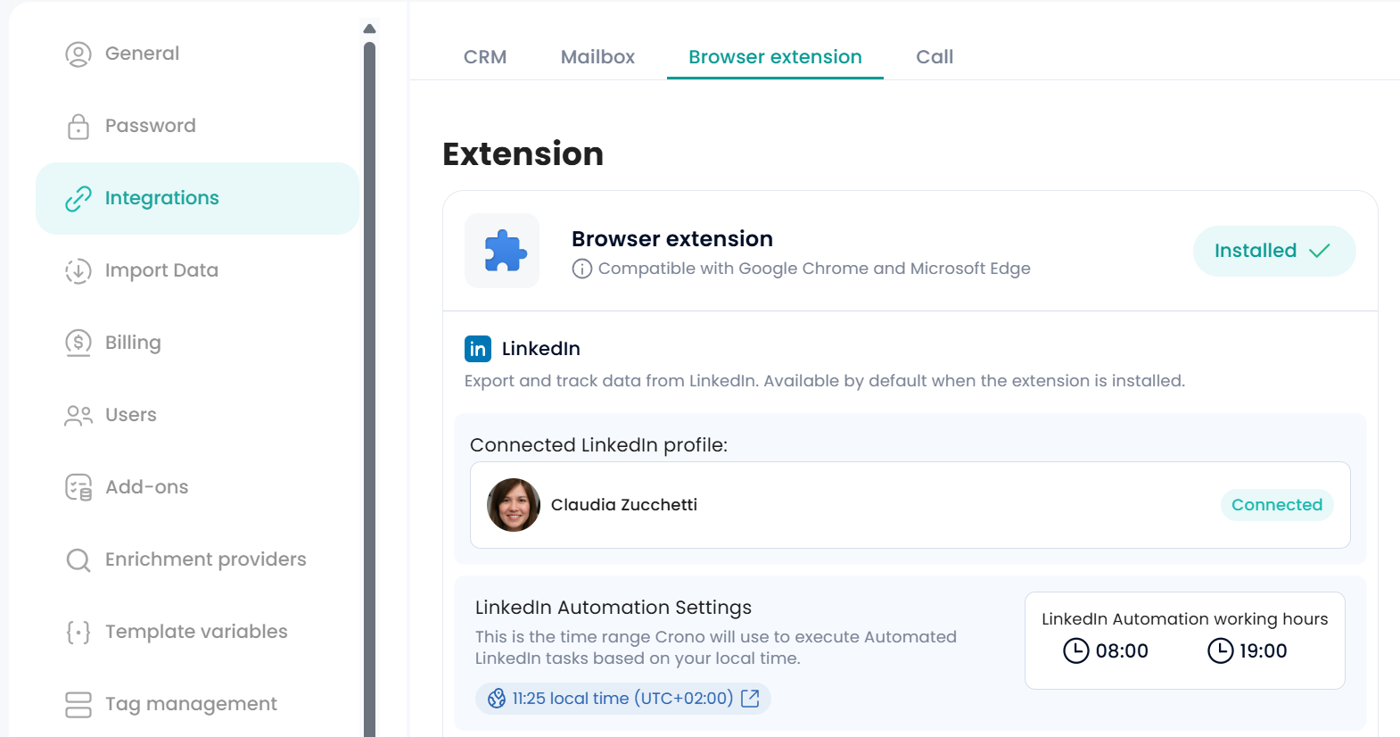 To start the installation process (if you did not install the extension when you first logged into Crono), access your Account Settings by clicking your name and surname and then, in the Integrations section, go to Browser extension: