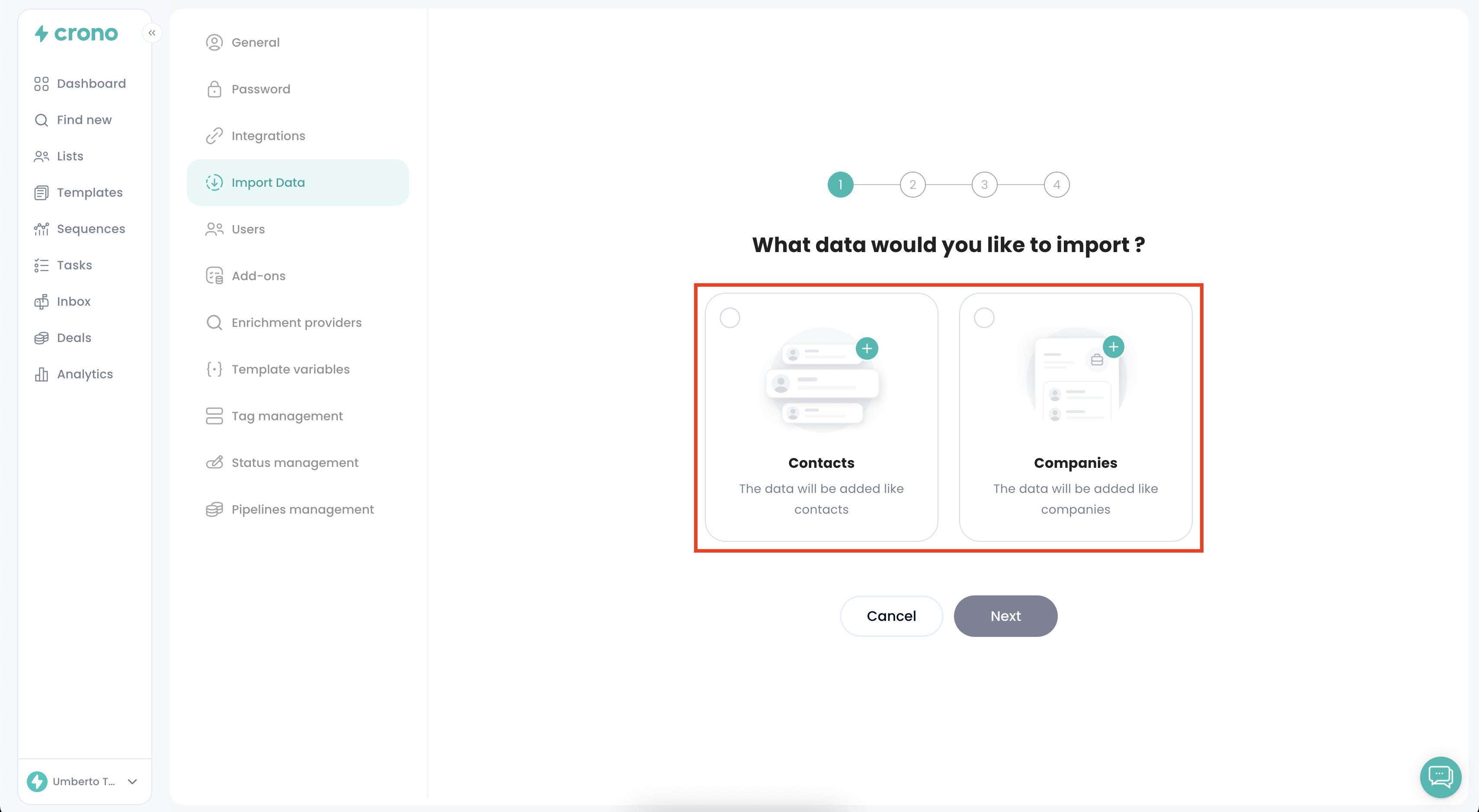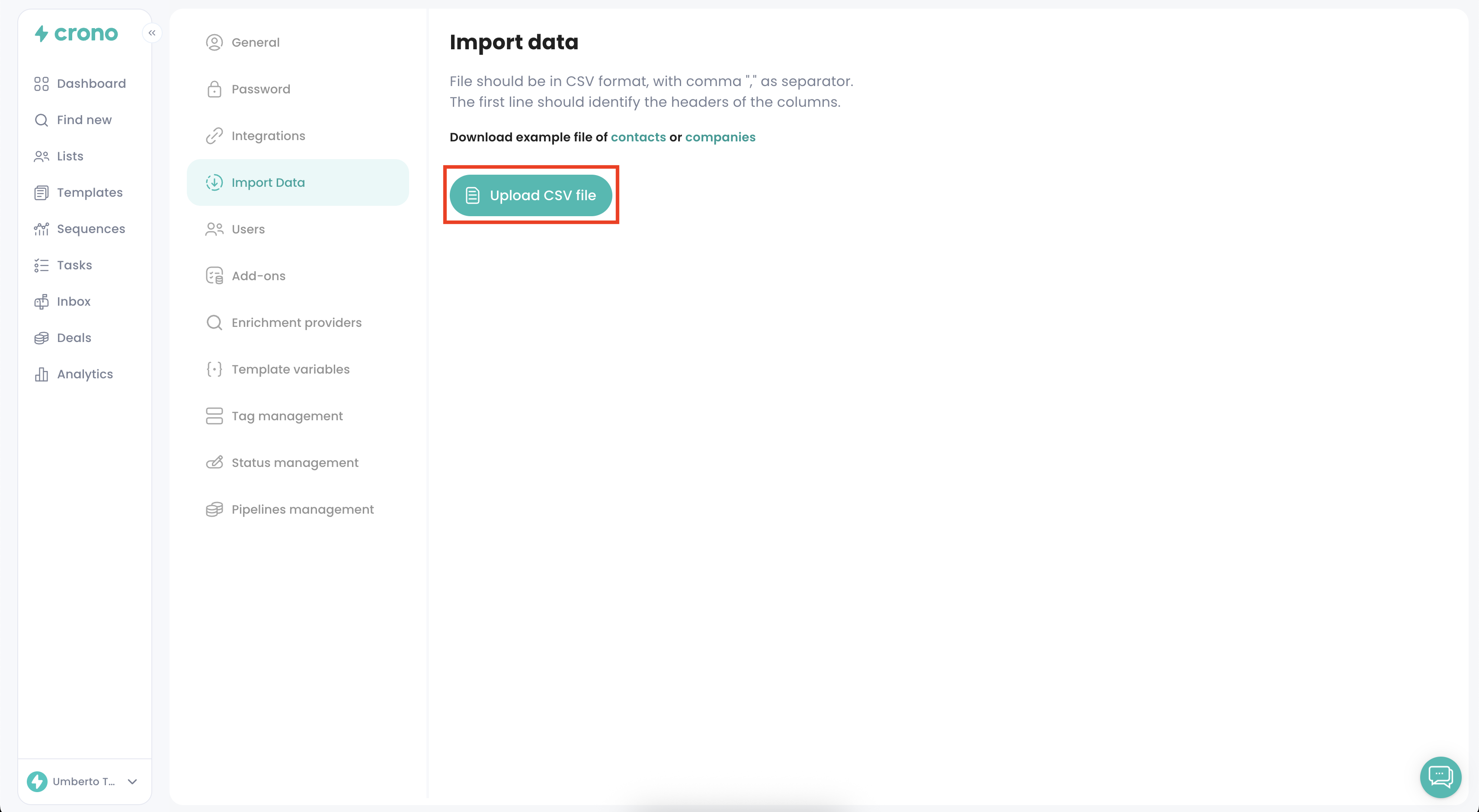 Contacts: if you import contacts, Crono will automatically create related Companies (if they donโt already exist)