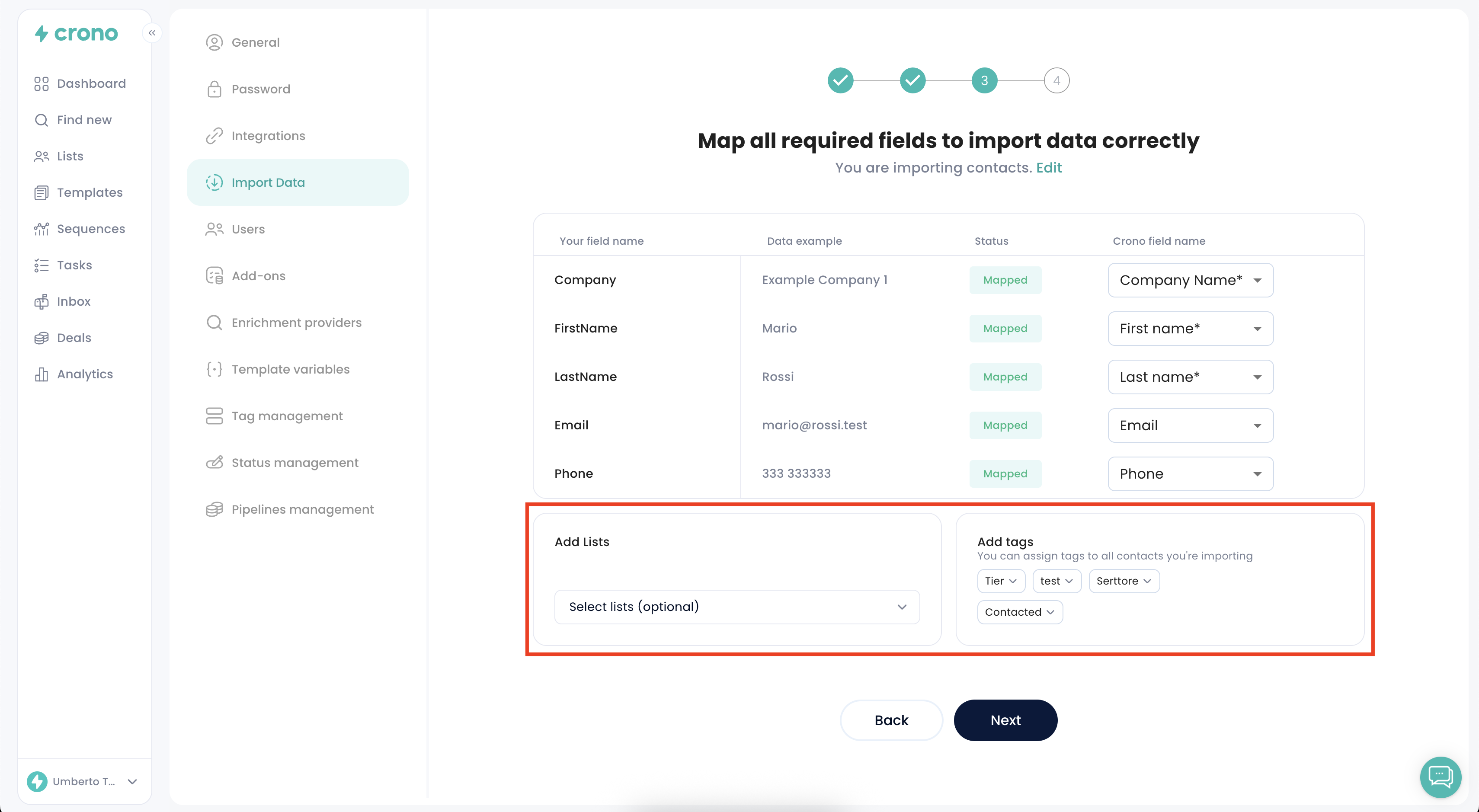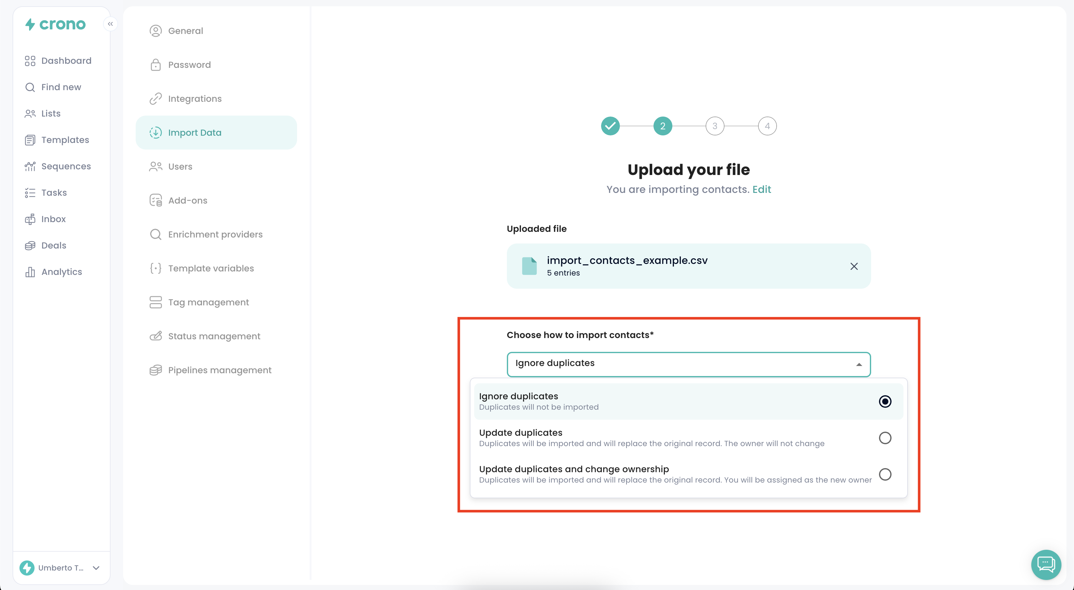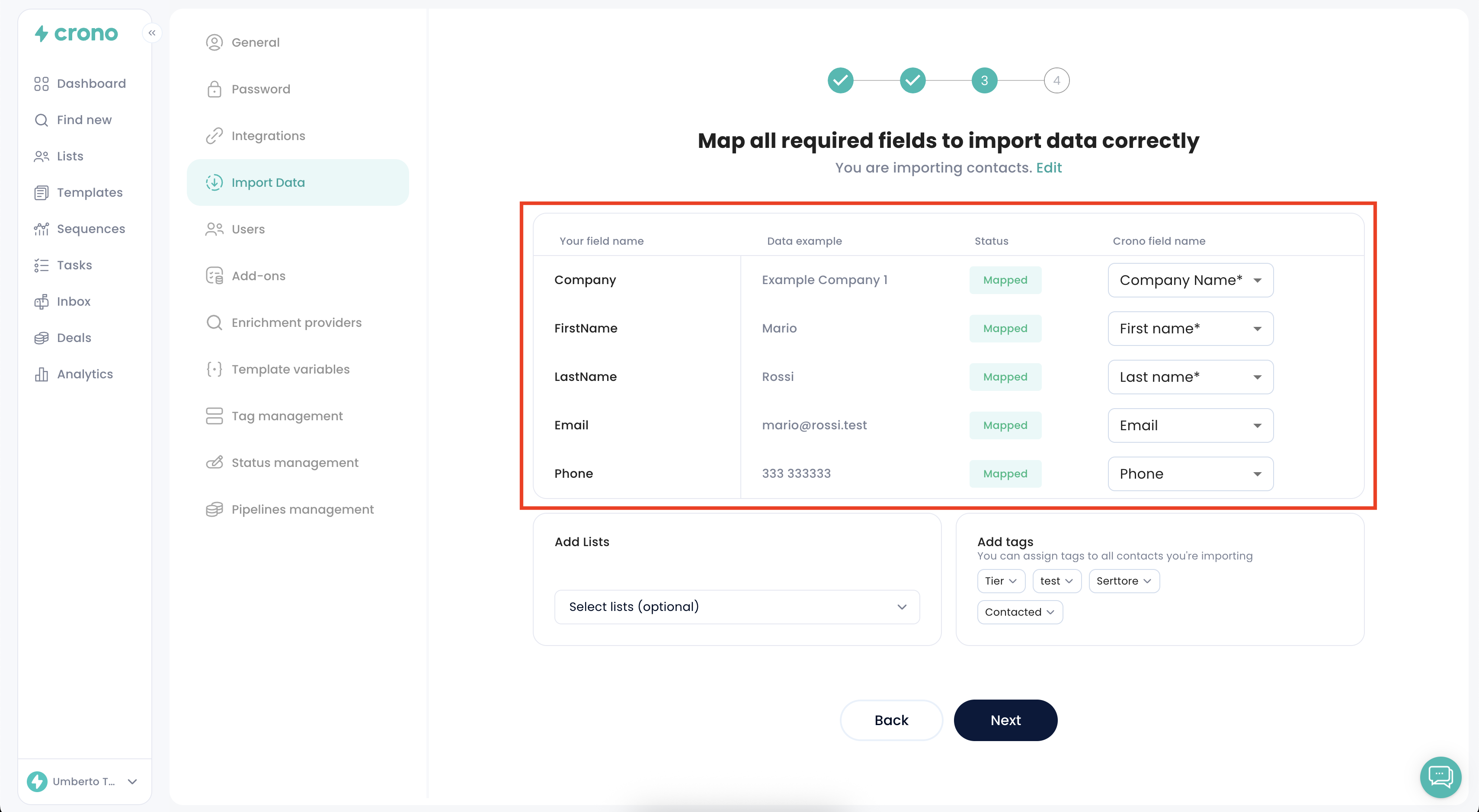 If needed, map the fields in your CSV to the corresponding Crono fields to ensure data is imported correctly. Once done, click Import file.