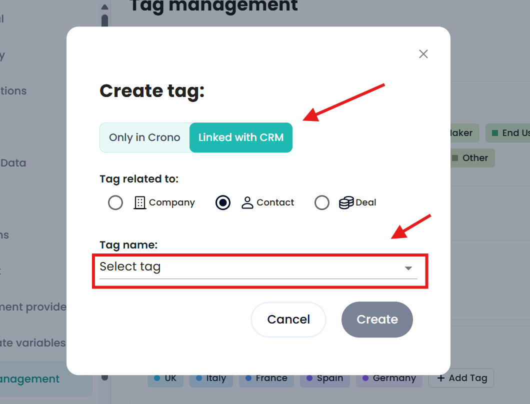 If your CRM already contains tags, you can connect them to Crono so you don’t need to recreate them manually.