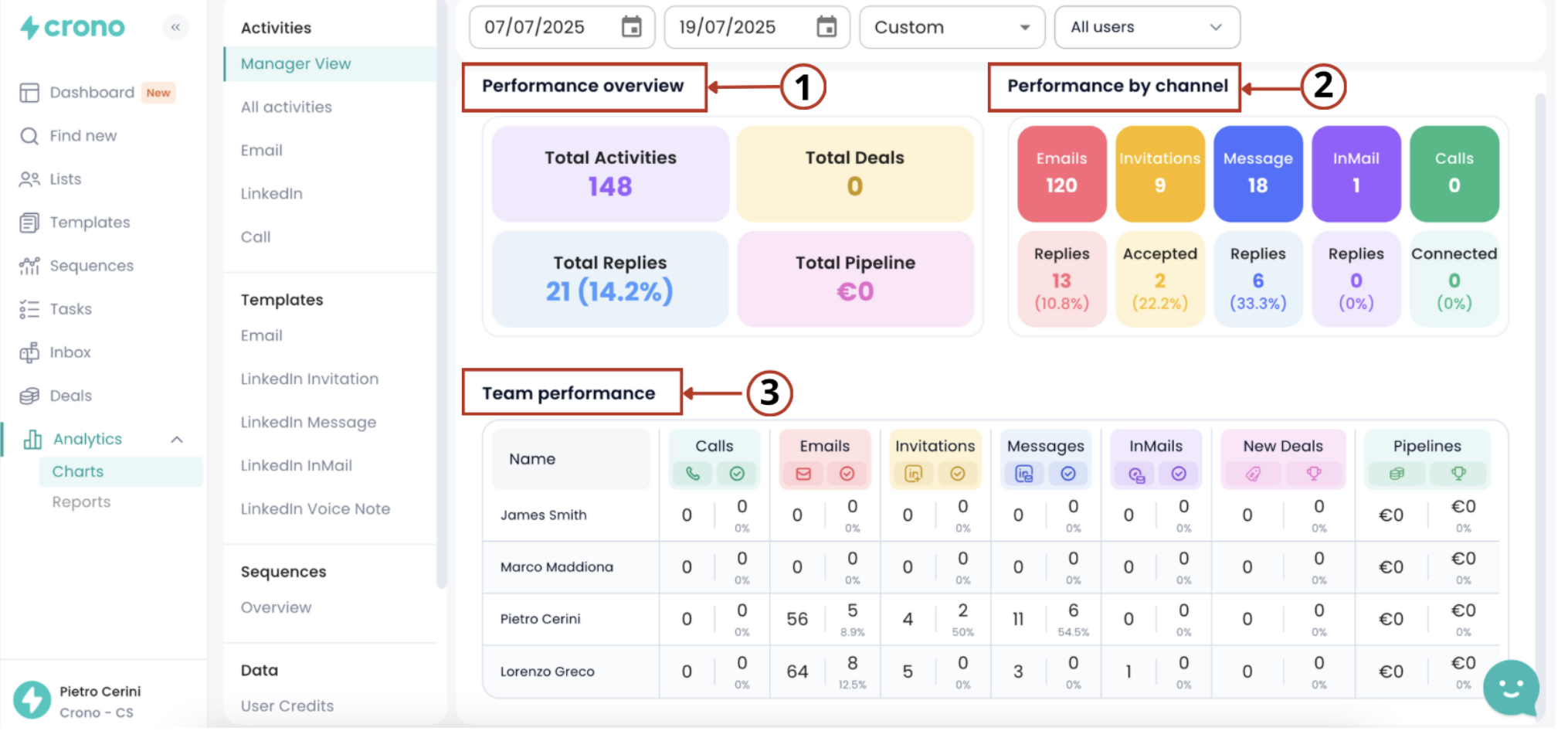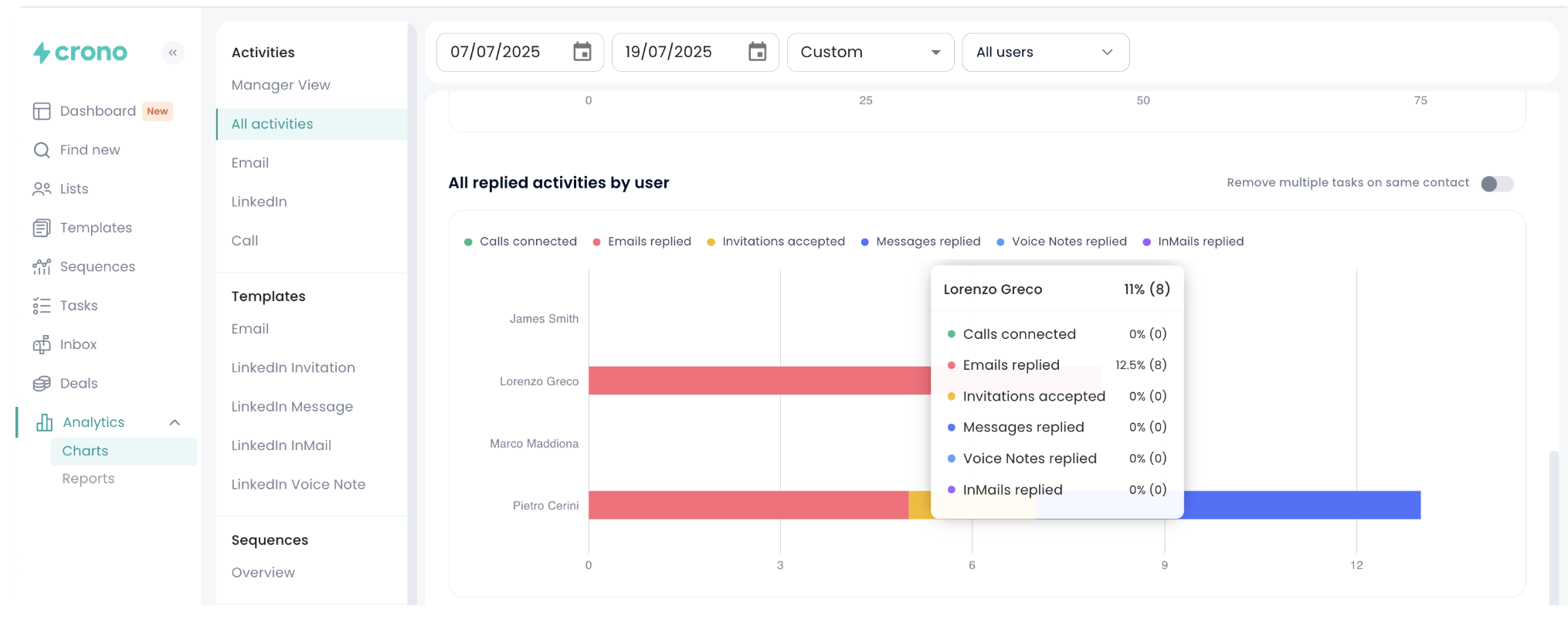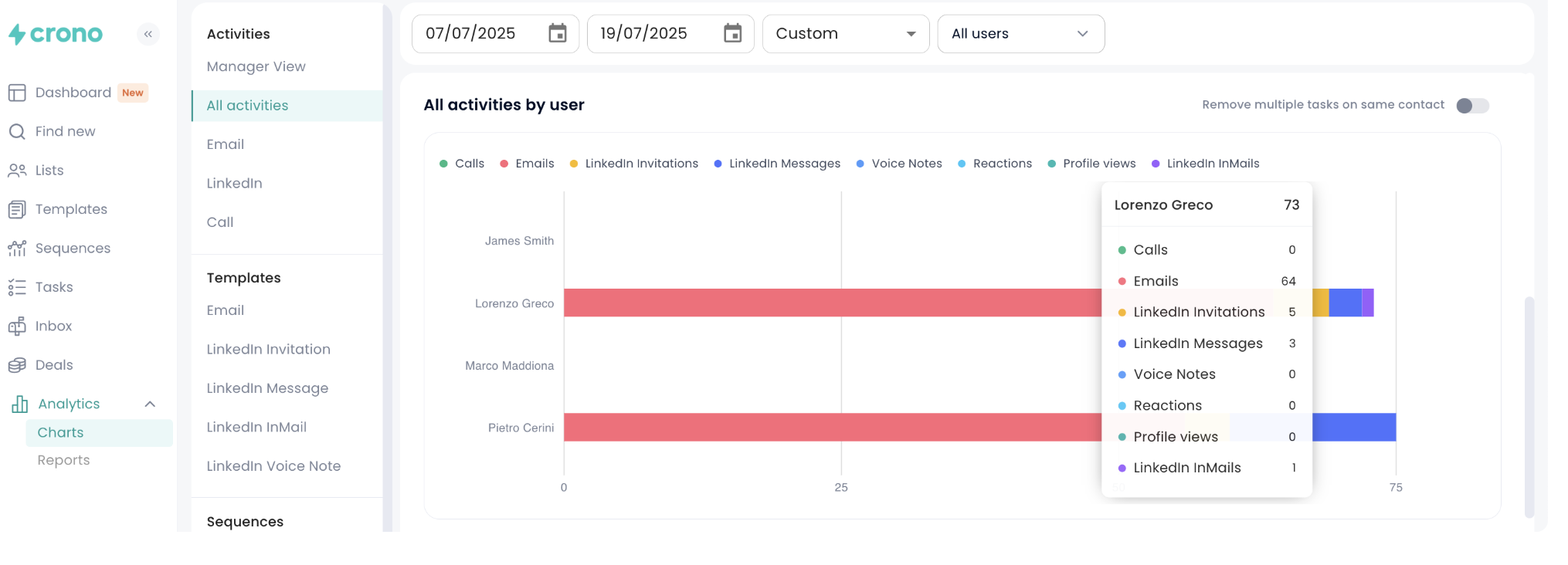 You can set the date range you're interested in and filter by specific users within your Crono environment to tailor the view to your needs.