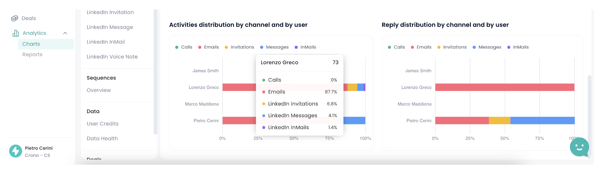 You can hover over each bar to view the exact percentage and count of activities performed per channel. For example, if a user has sent mostly emails and only a few InMails or LinkedIn messages, this will be reflected here. This view is useful for identifying channel preferences or imbalances within the team.