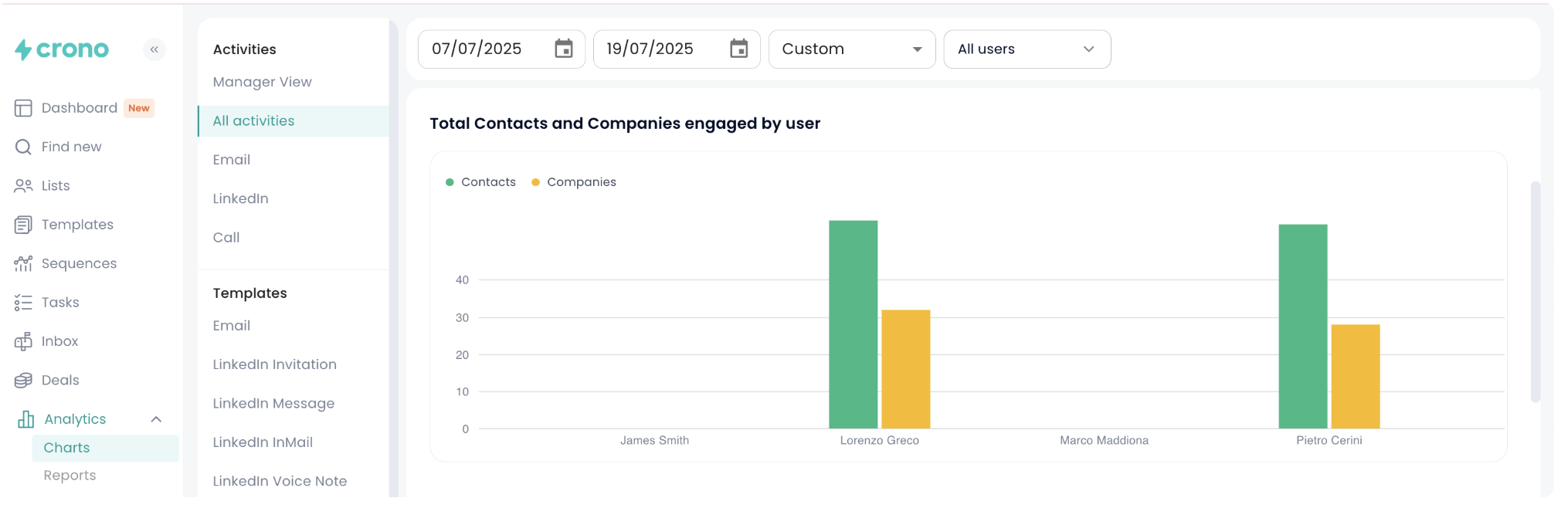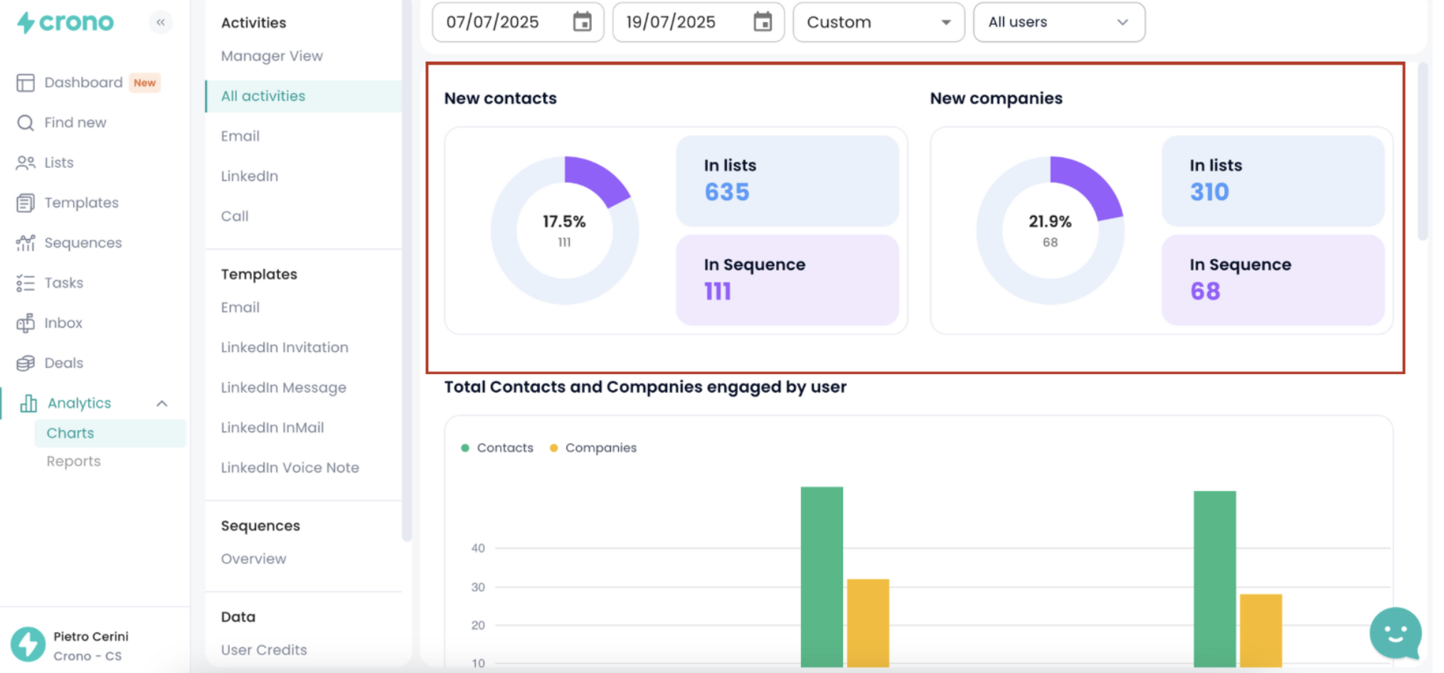 This section helps managers understand not only the volume of new data added to Crono but also how actively those contacts and companies are being engaged through Sequences.
