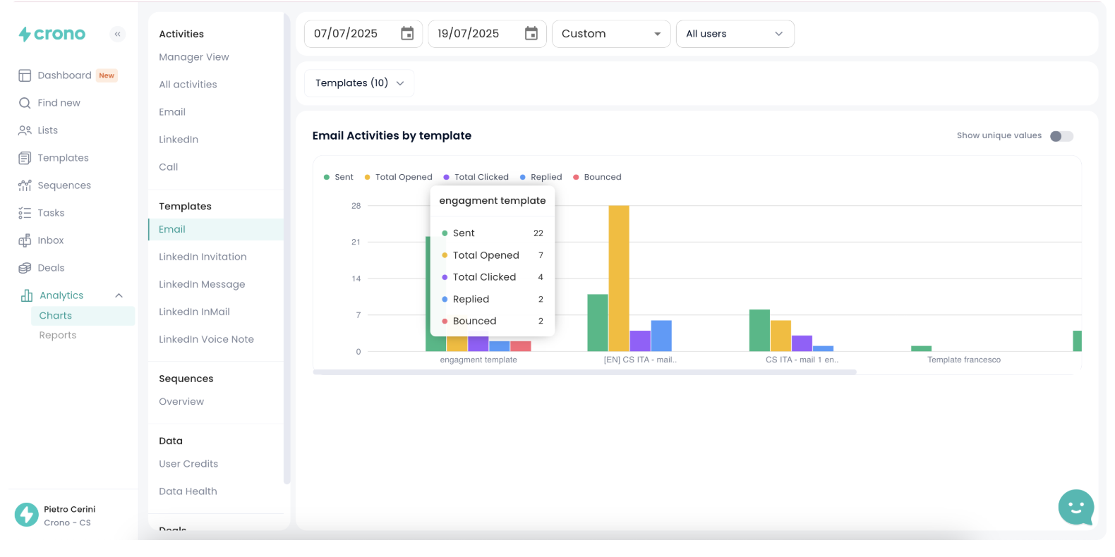 By hovering over each bar, you’ll see the exact values for every metric. This makes it easy to compare template performance and identify which ones drive the most engagement.