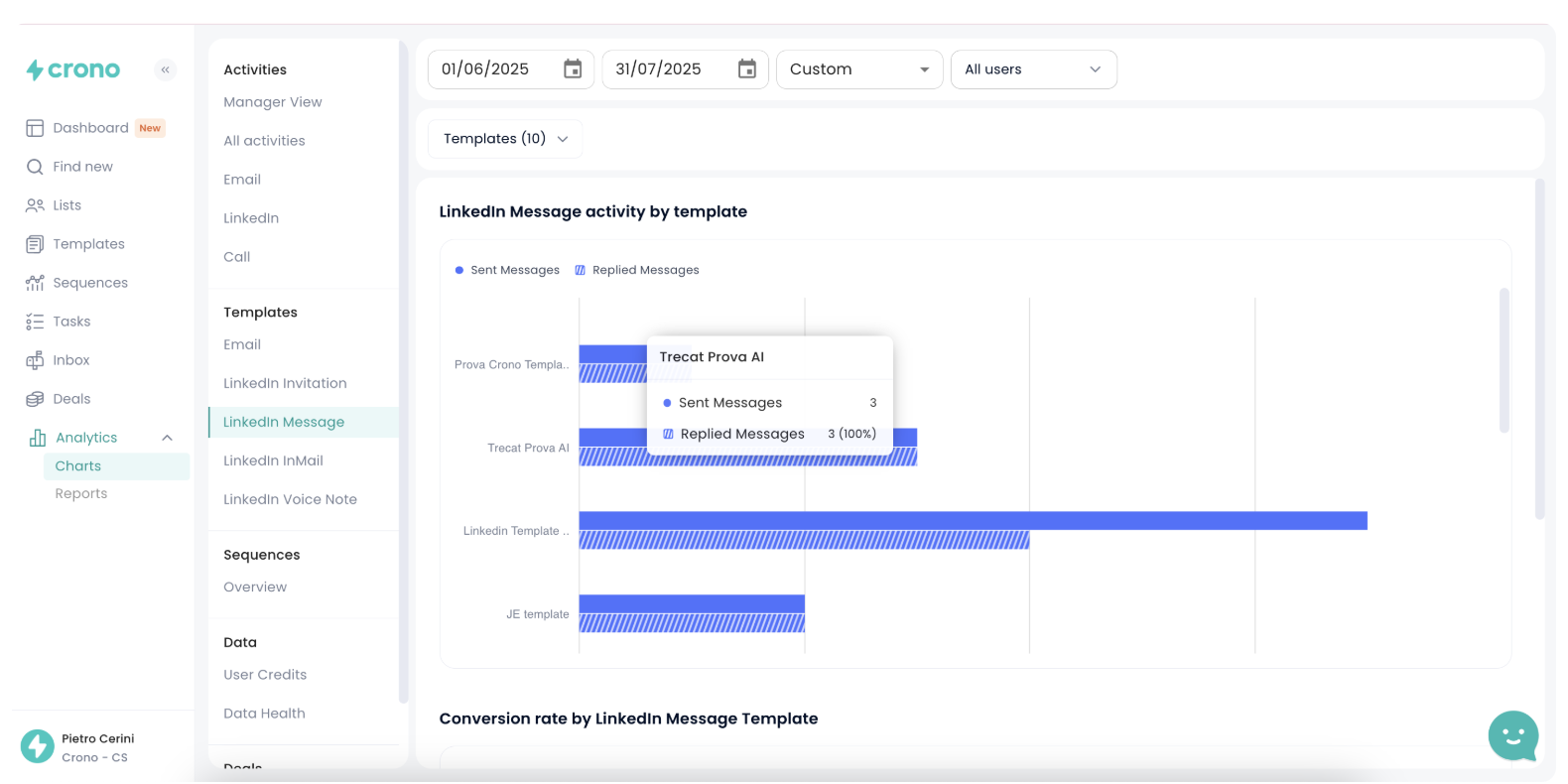 This section helps you monitor the performance of each LinkedIn Message template used in Crono. These same metrics and visualizations are also available for LinkedIn Invitation Templates, InMail Templates, and LinkedIn Voice Notes, allowing you to assess performance across all message types used in Crono.