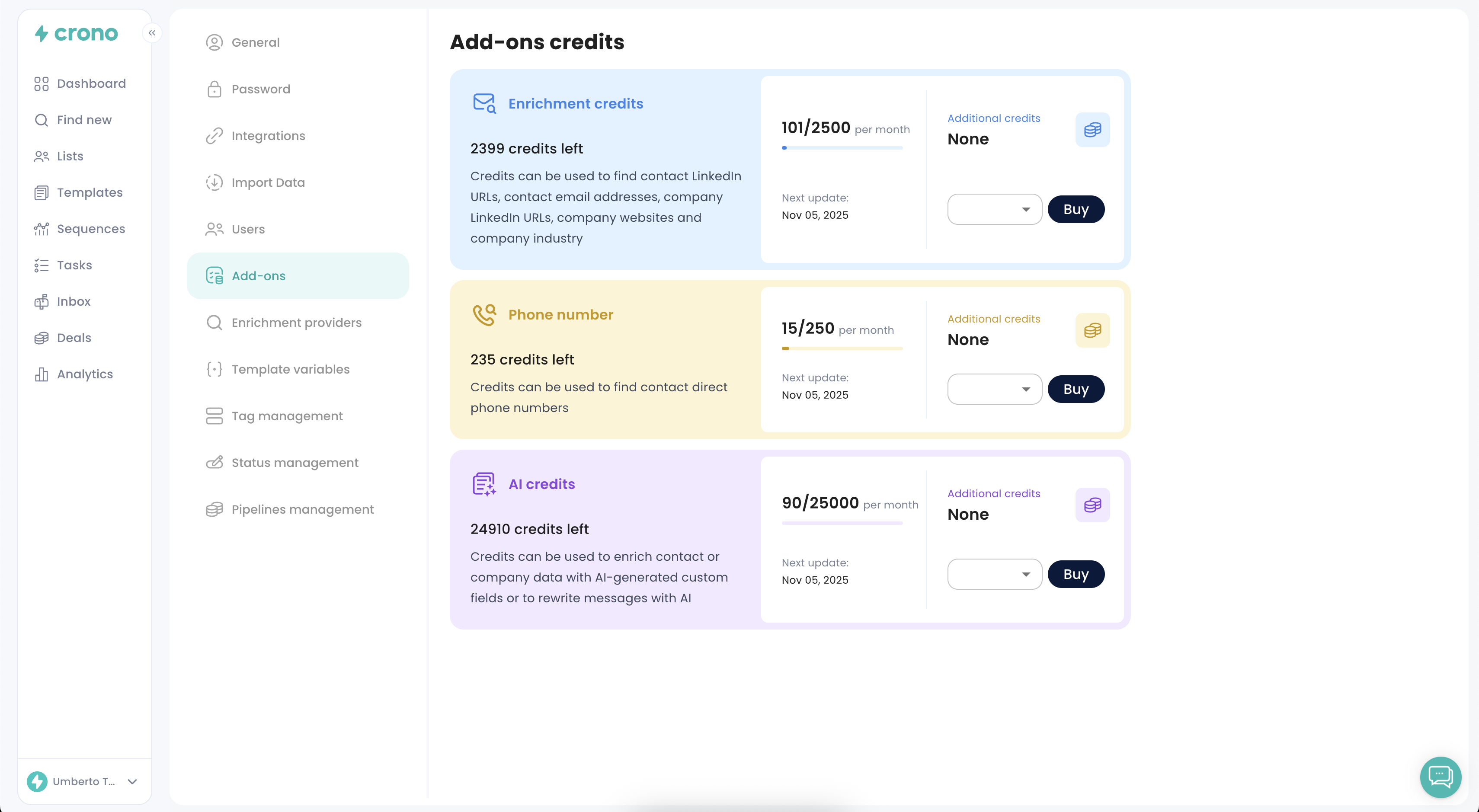 Here you can purchase extra credits for Email Finder, Phone Numbers, and AI.
