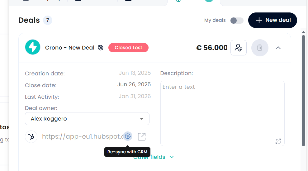 Behind the scenes, Crono treats the company as the central entity. This means that re-syncing from a deal does not update only the deal itself, but also refreshes the full company context, including contacts, company details, and any deal-related information available in the CRM.