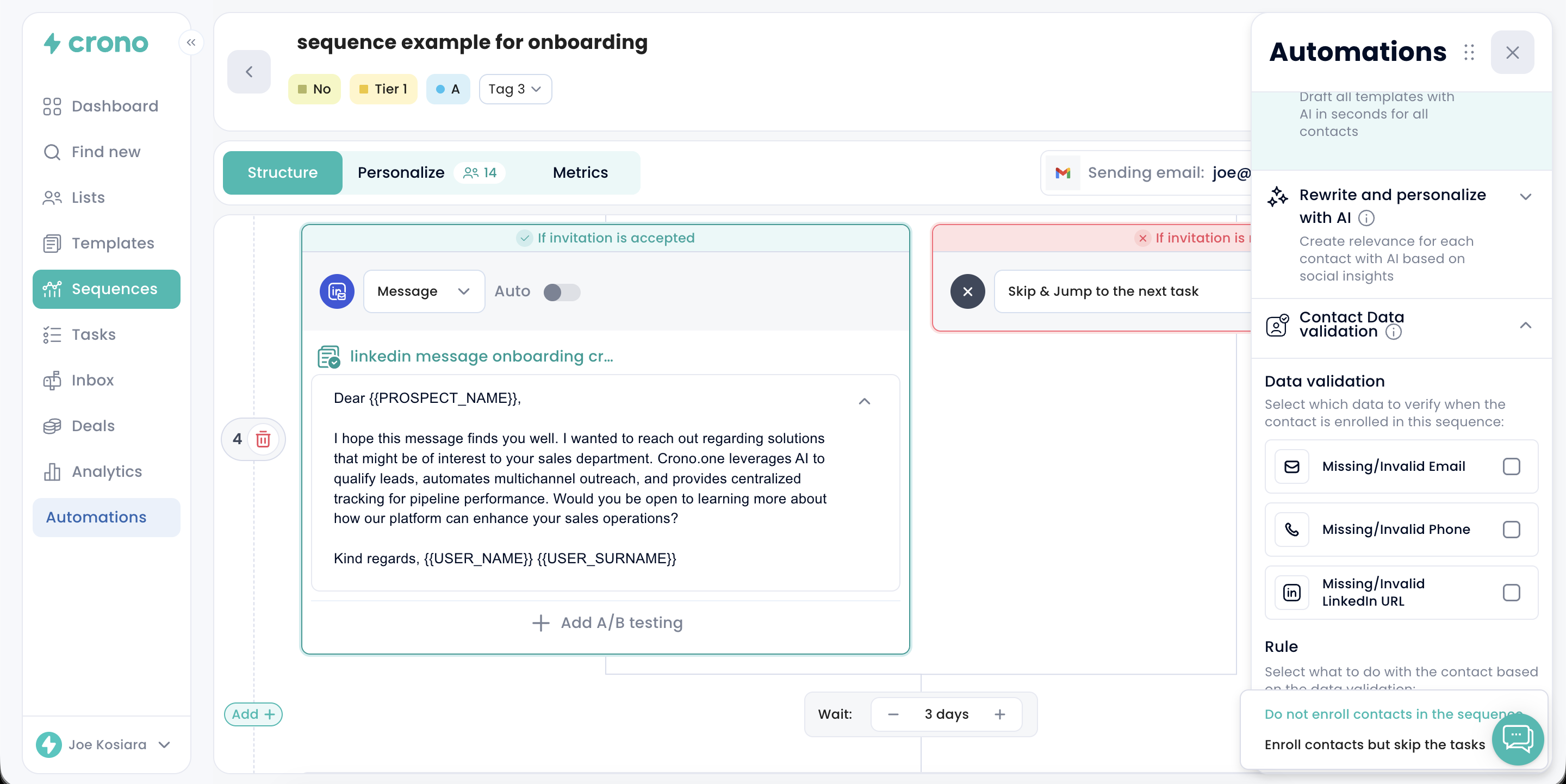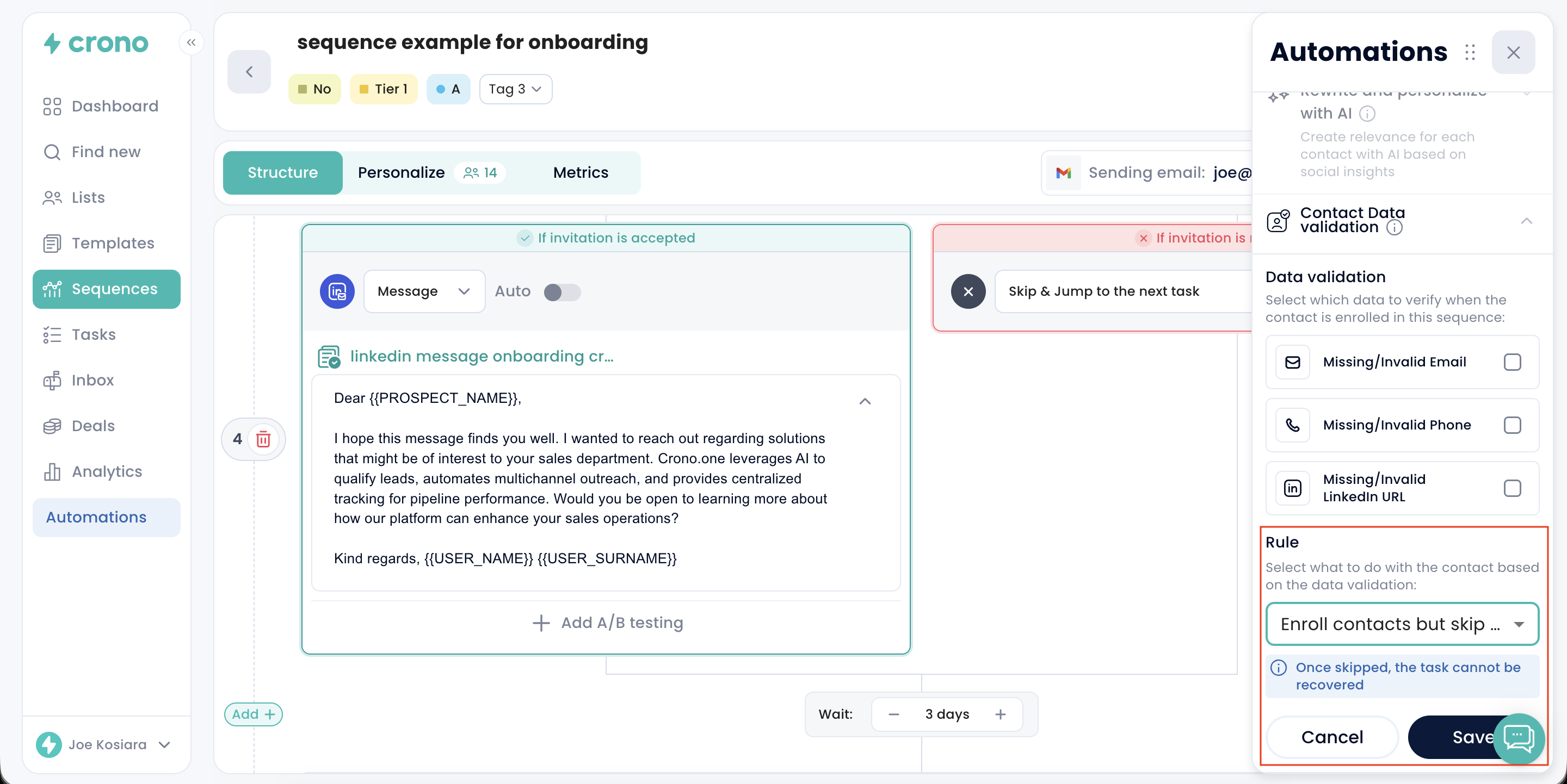 In practice, this means that when the system reaches an automated task requiring a field that the contact does not possess — for example, a LinkedIn URL for a LinkedIn message — that task will be skipped. Crono will then automatically continue to the next actionable step in the sequence.