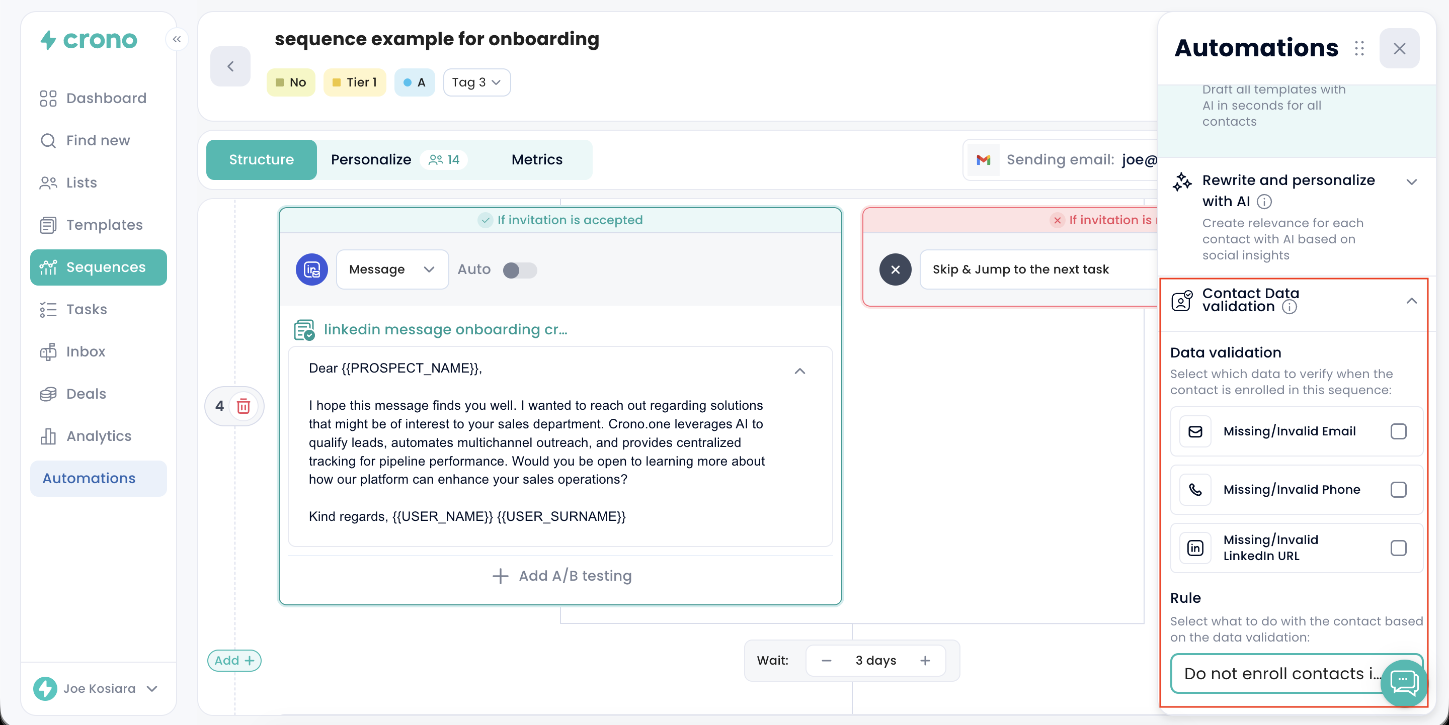 If a contact lacks one or more of the required fields, Crono will automatically prevent them from entering the sequence. This ensures that: