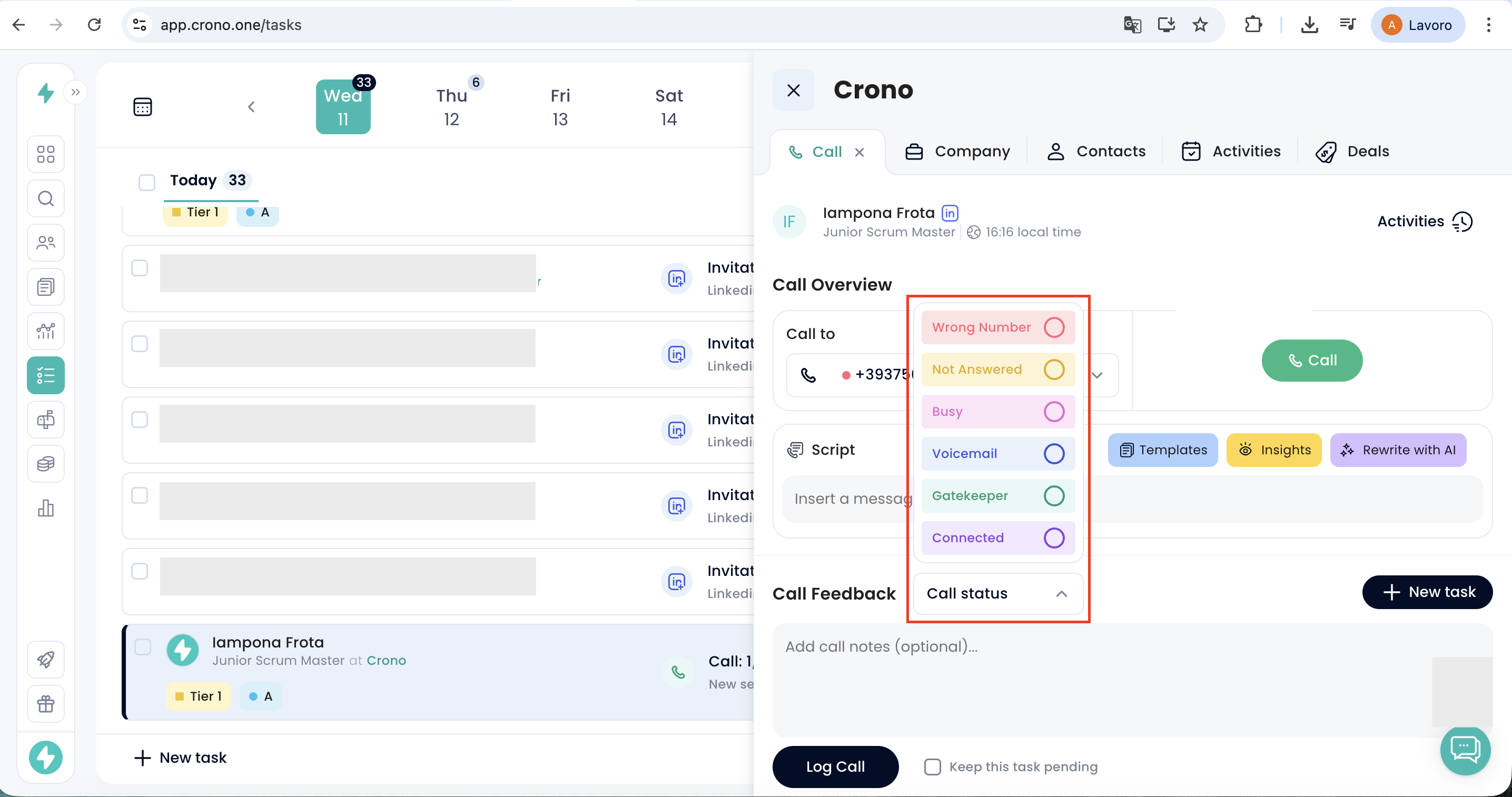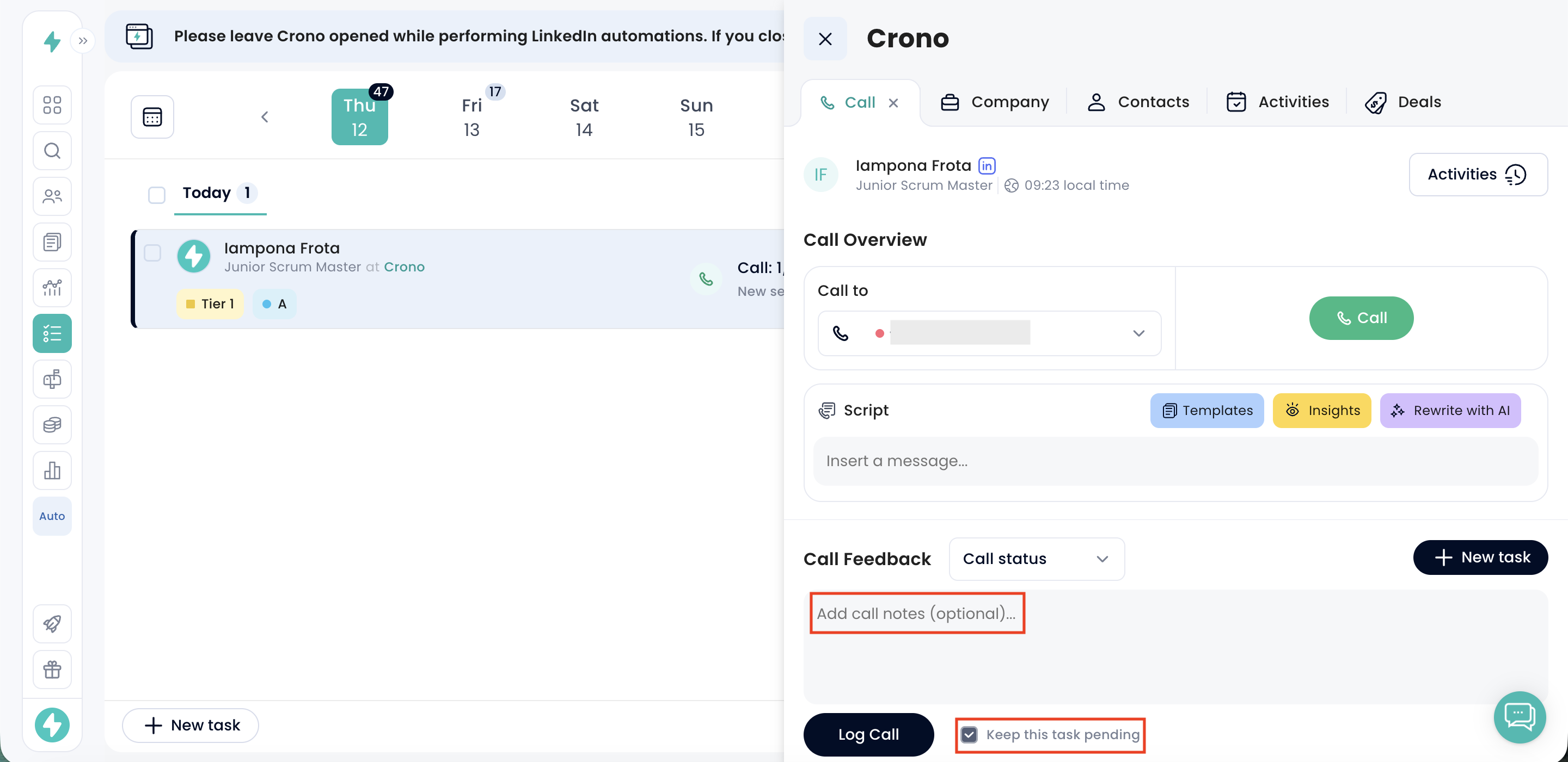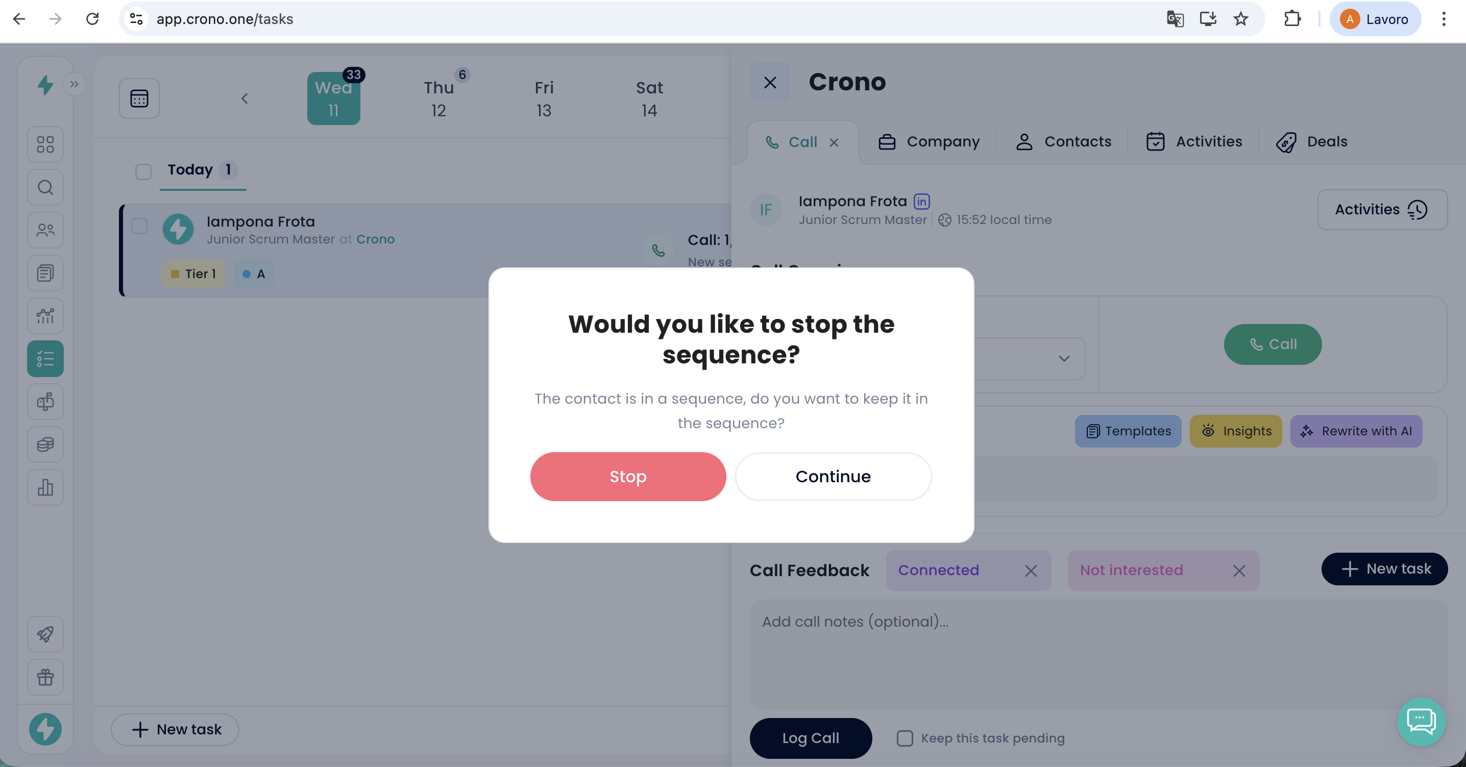 Logging calls correctly in Crono helps you keep your sequences organized, track conversations, and ensure the next steps with a contact are clear. When a call step is part of a sequence, the activity will appear in your Tasks section so you can complete and log the outcome.